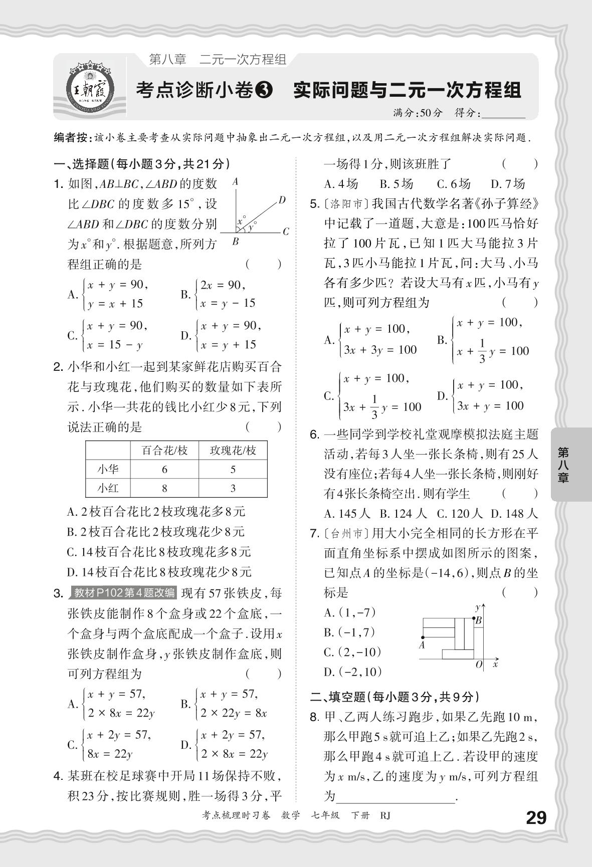 2024春下册七年级数学人教版 第八章 考点诊断小卷 实际问题与二元一次方程组【3】