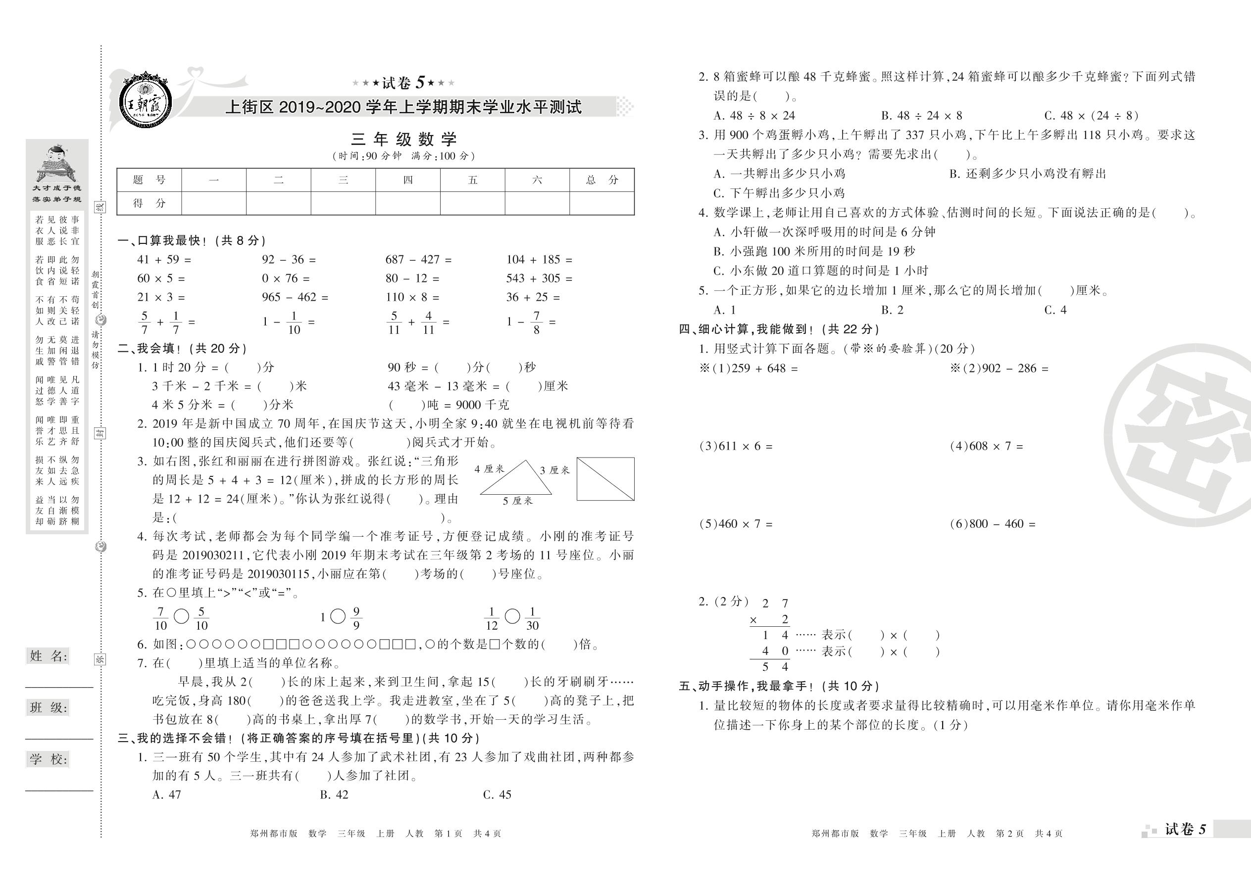 2019-2020学年第一学期郑州市上街区三年级数学试卷(人教版)【5】