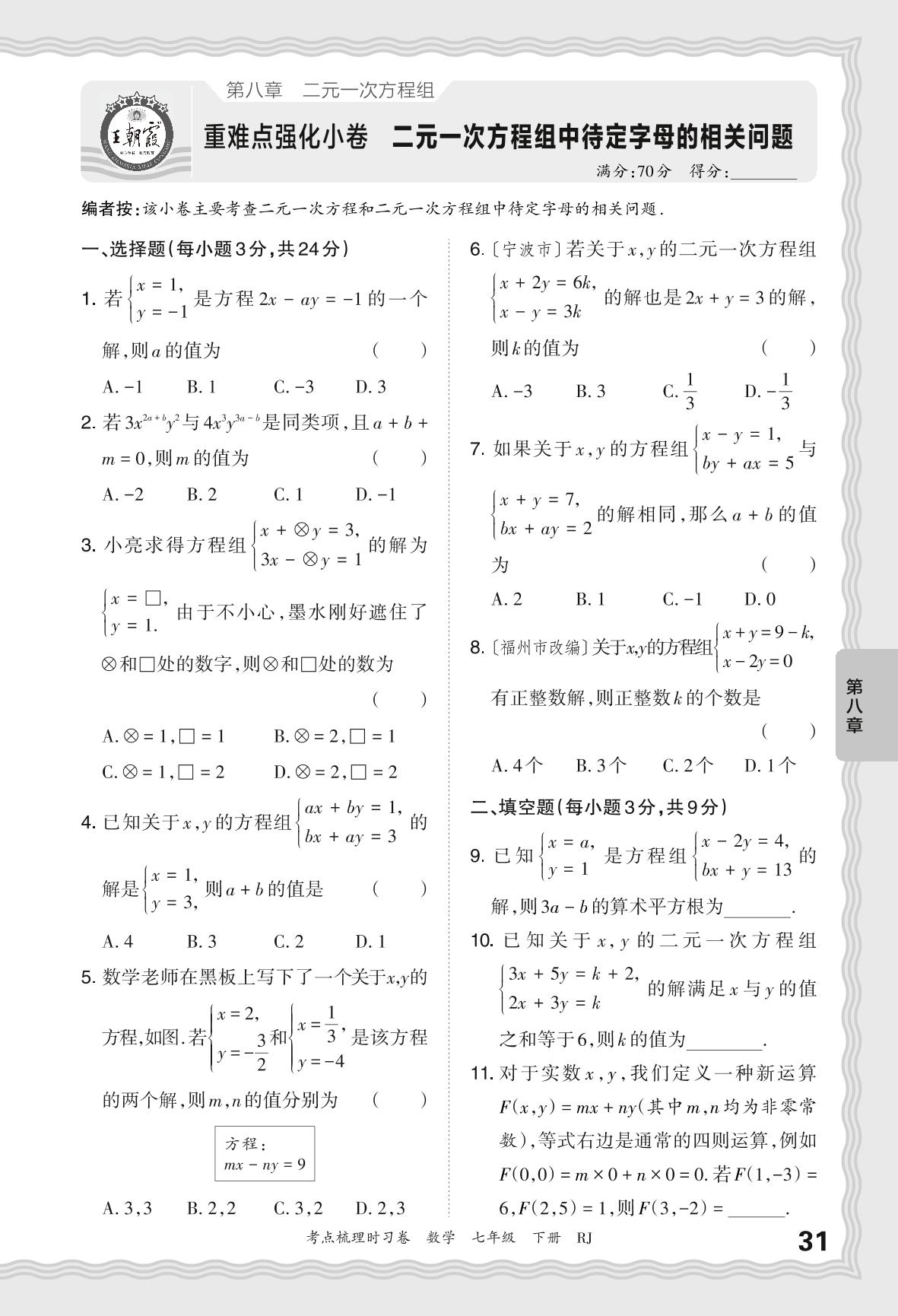 2024春下册七年级数学人教版 第八章 重难点强化小卷 二元一次方程组中待定字母的相关问题