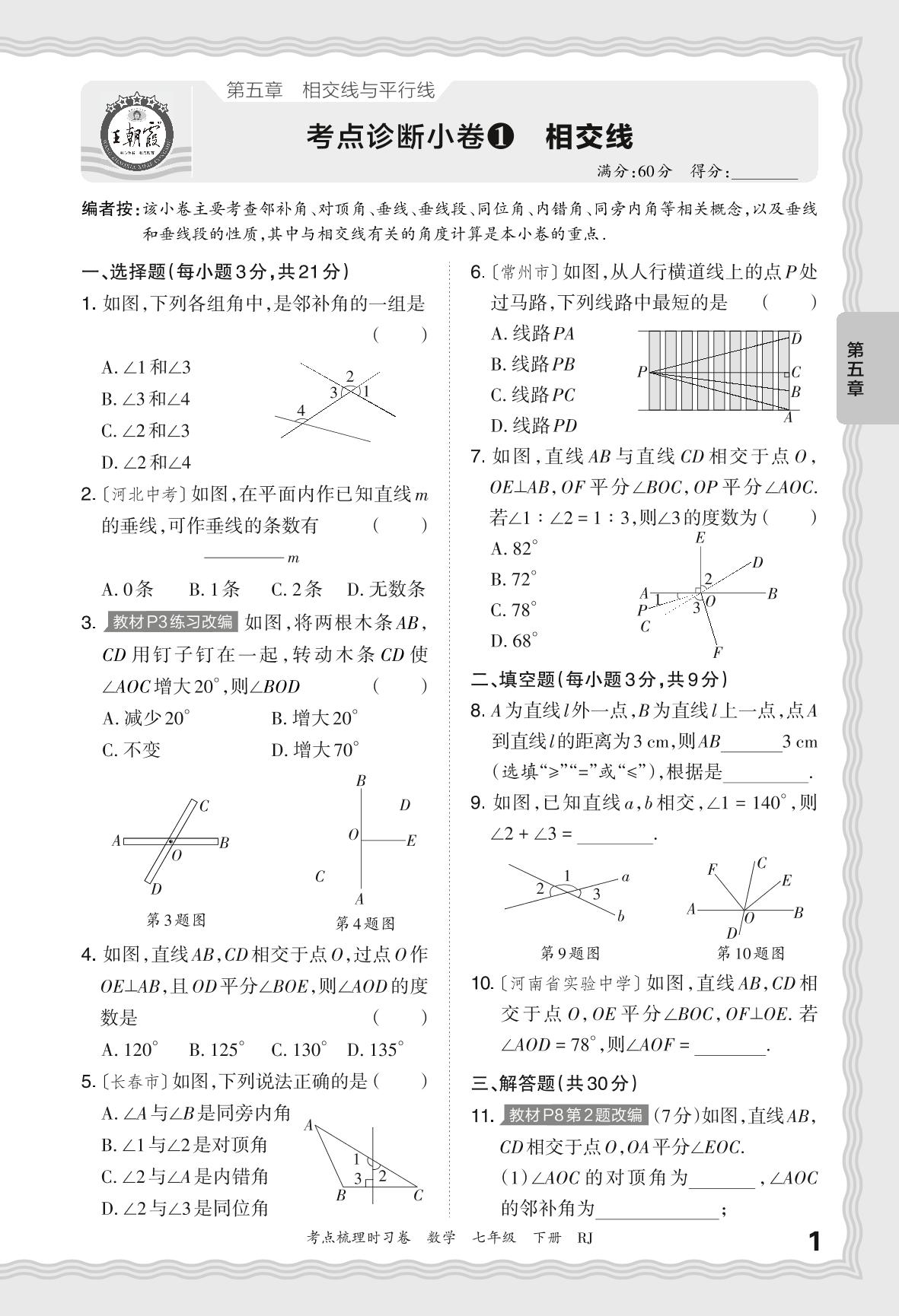 2024春下册七年级数学人教版 第五章 考点诊断小卷 相交线【1】