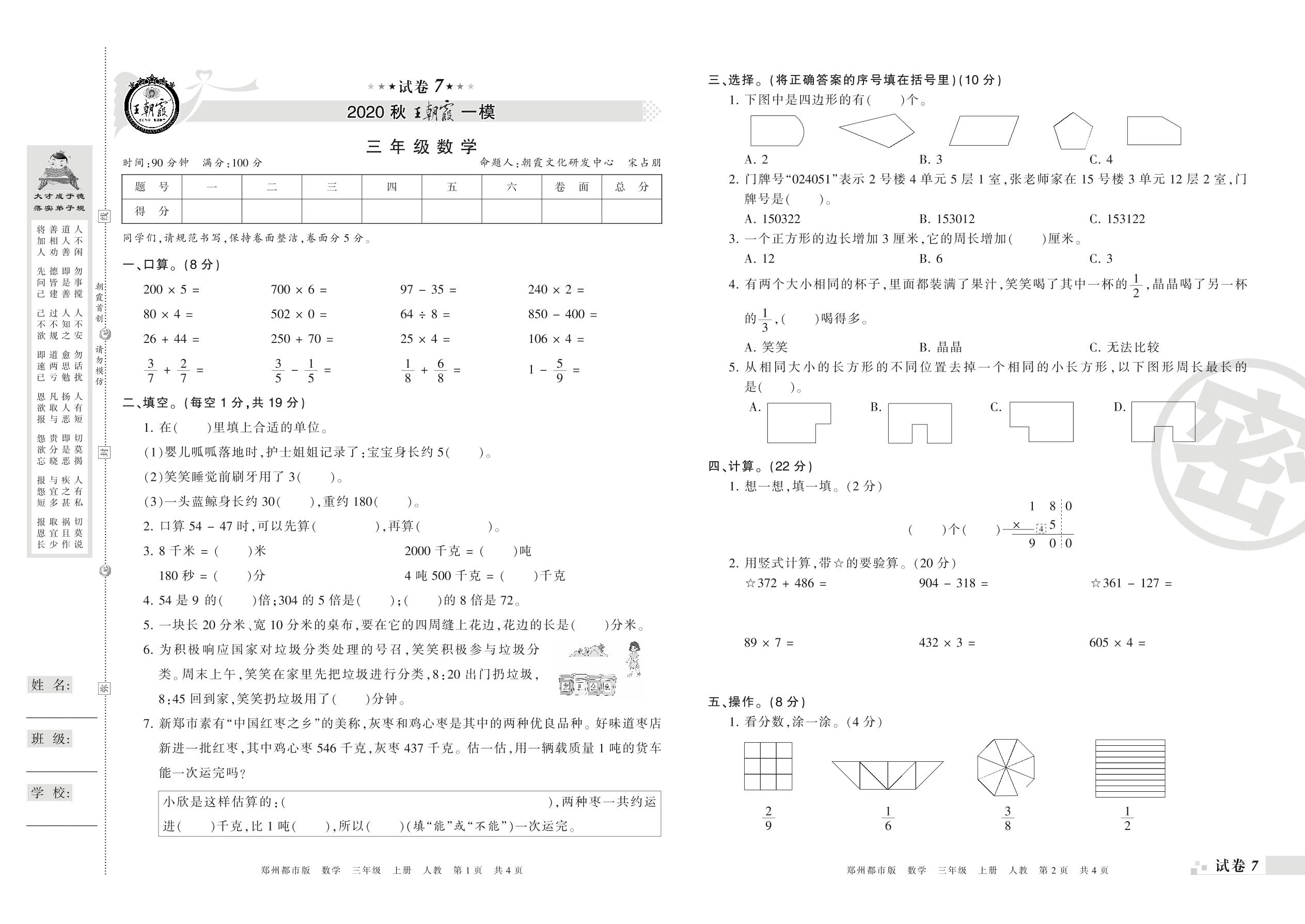 王朝霞期末模拟卷三年级上册数学(人教版)_R21080492650【7】