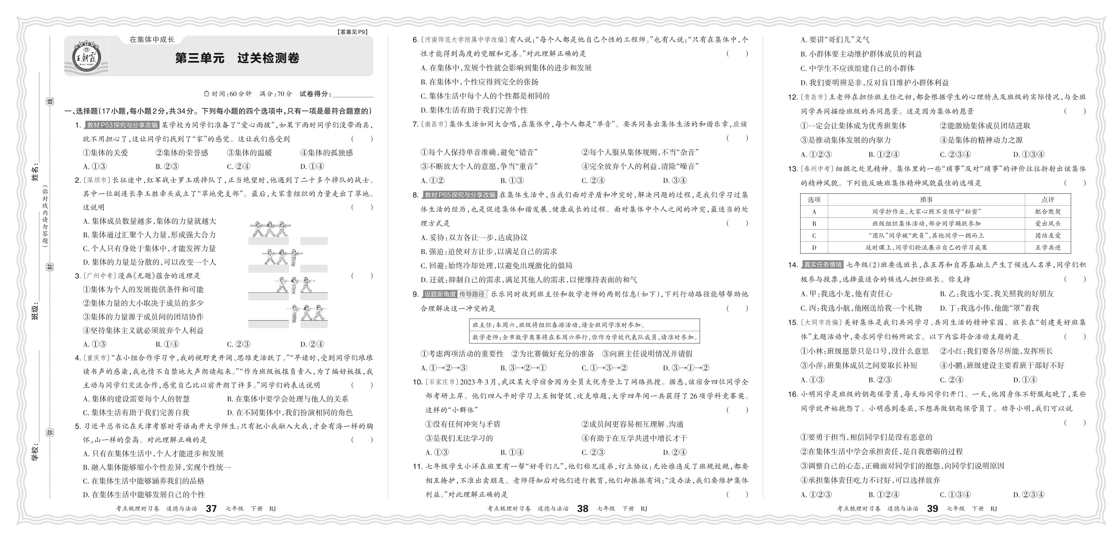 2024春下册七年级道德与法治人教版 第三单元 过关检测卷