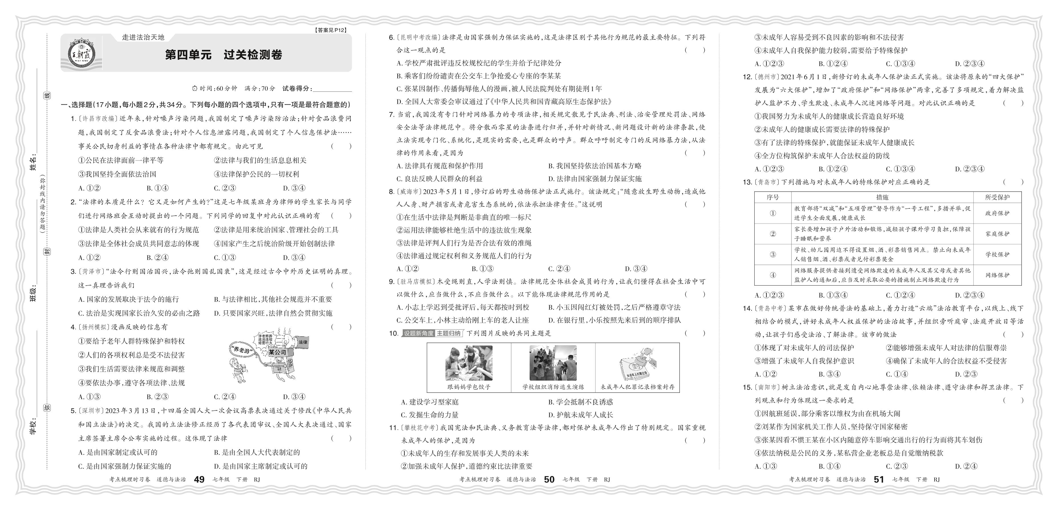 2024春下册七年级道德与法治人教版 第四单元 过关检测卷