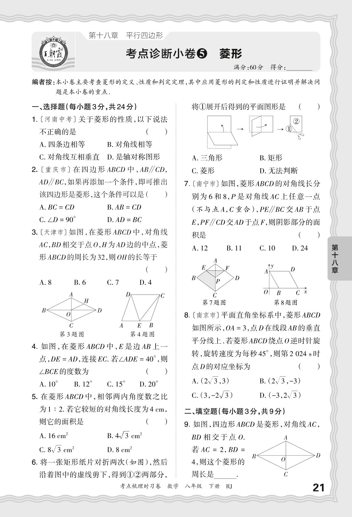 2024春下册八年级数学人教版 第十八章 考点诊断小卷 菱形【5】
