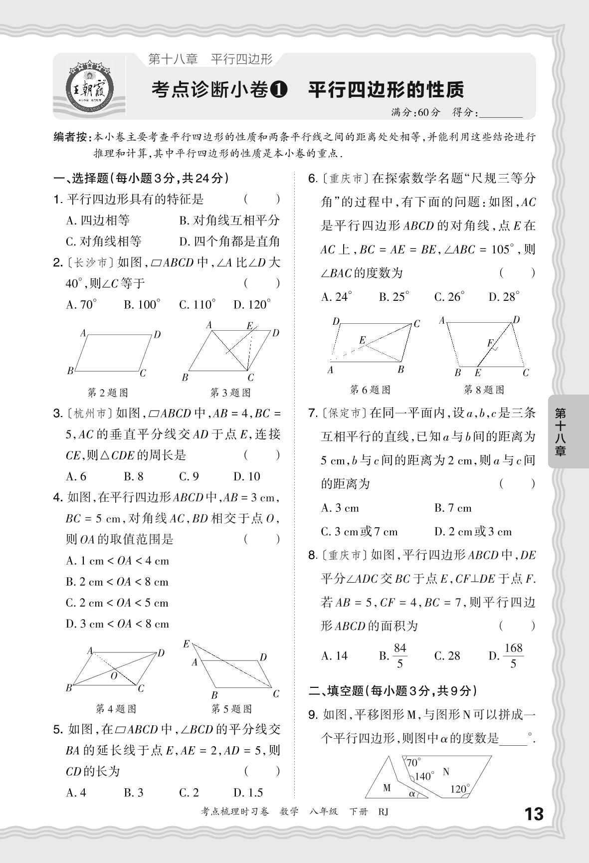 2024春下册八年级数学人教版 第十八章 考点诊断小卷 平行四边形的性质【1】