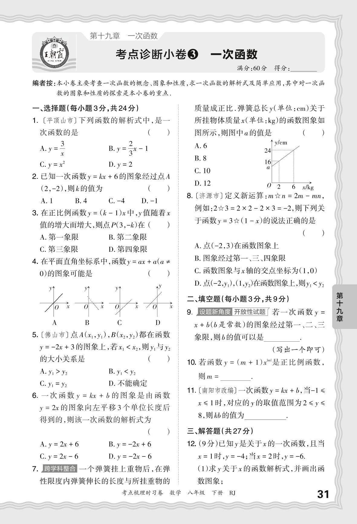 2024春下册八年级数学人教版 第十九章 考点诊断小卷 一次函数【3】