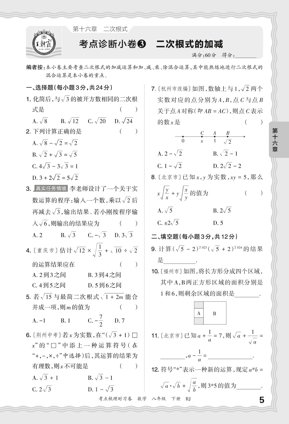 2024春下册八年级数学人教版 第十六章 考点诊断小卷 二次根式的加减【3】