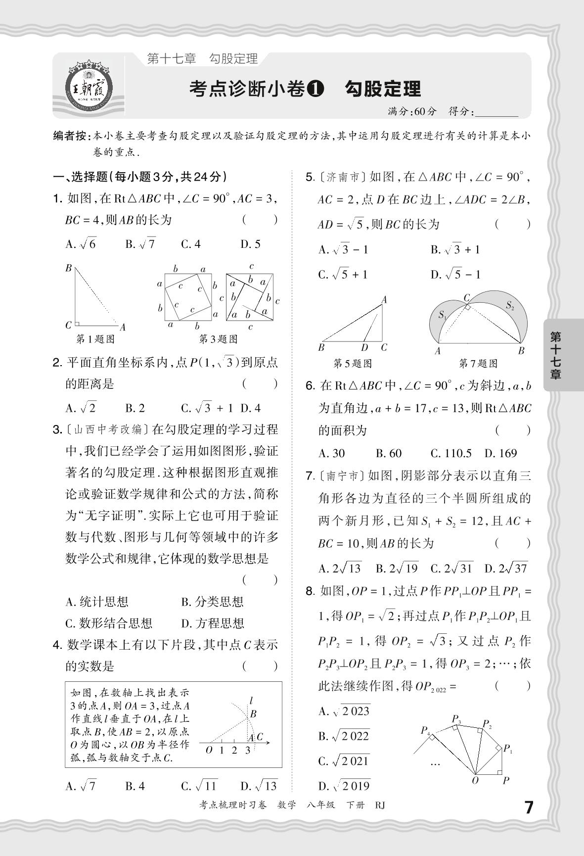 2024春下册八年级数学人教版 第十七章 考点诊断小卷 勾股定理【1】