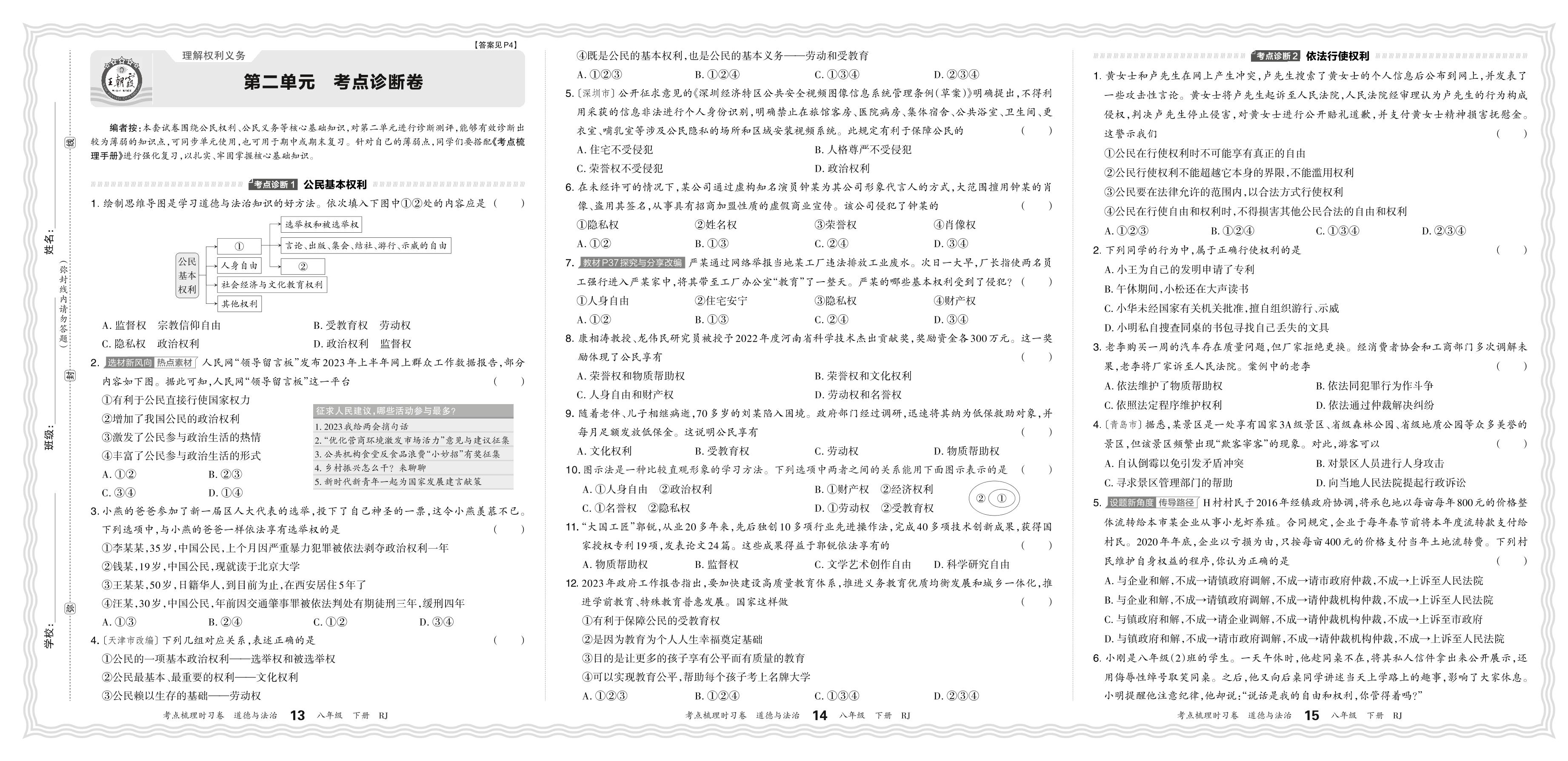2024春下册八年级道德与法治人教版 第二单元 考点诊断卷