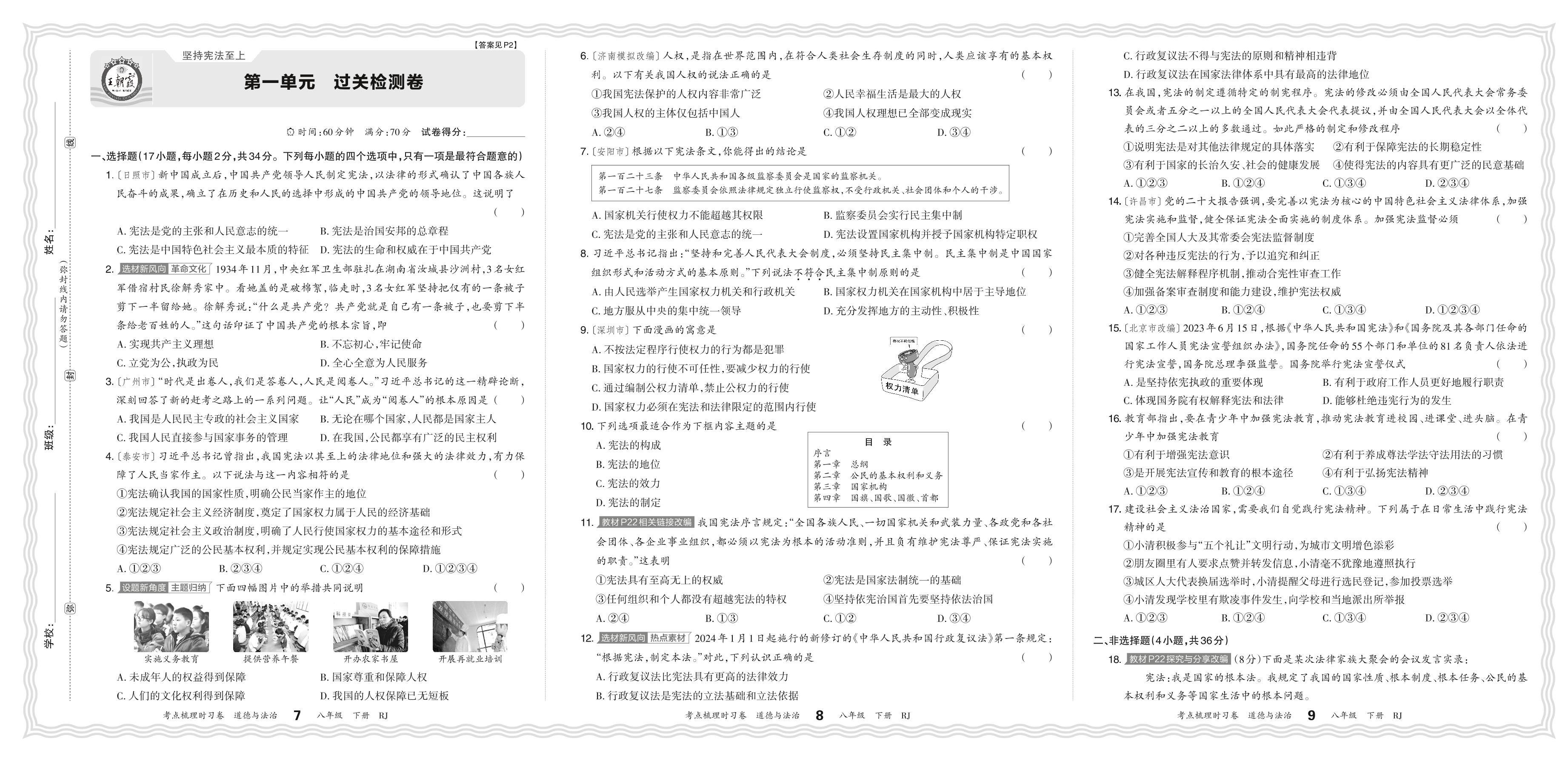 2024春下册八年级道德与法治人教版 第一单元 过关检测卷