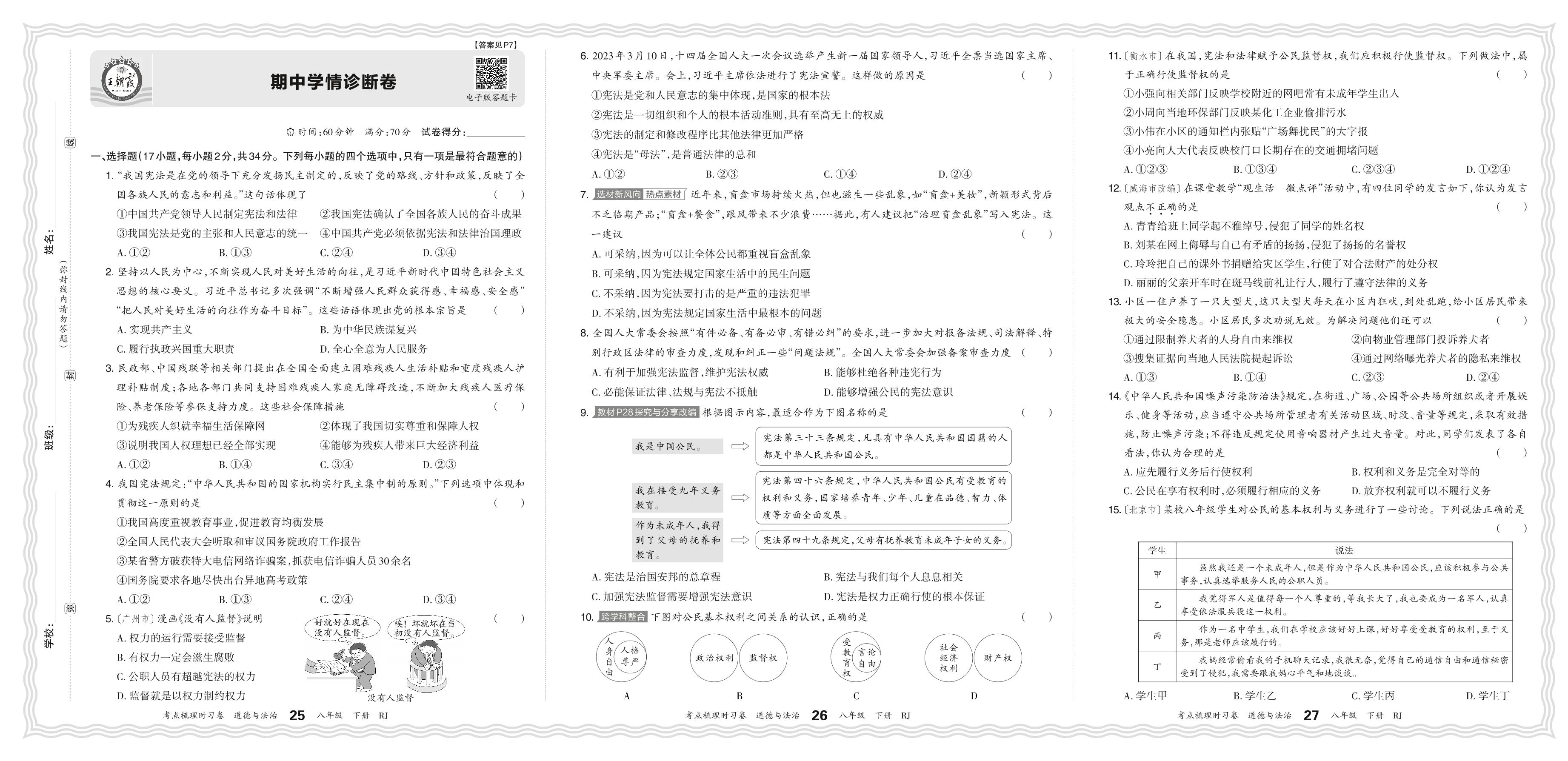 2024春下册八年级道德与法治人教版 期中学情诊断卷