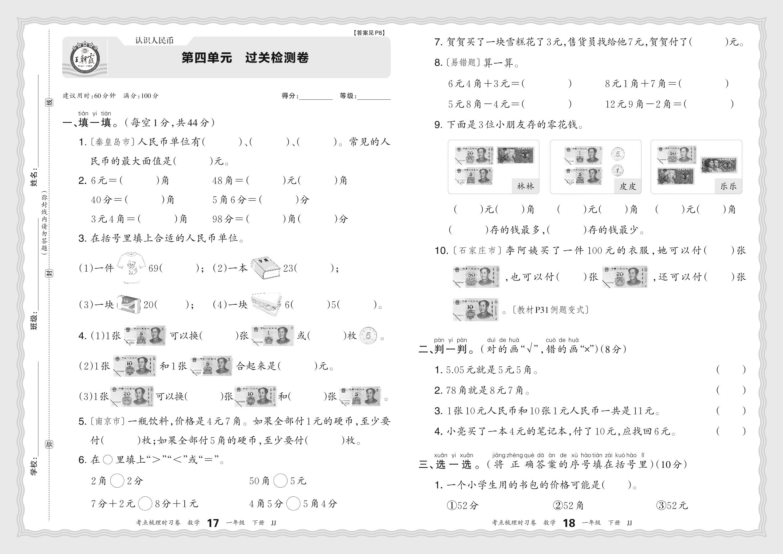 一年级数学冀教版下册单元卷