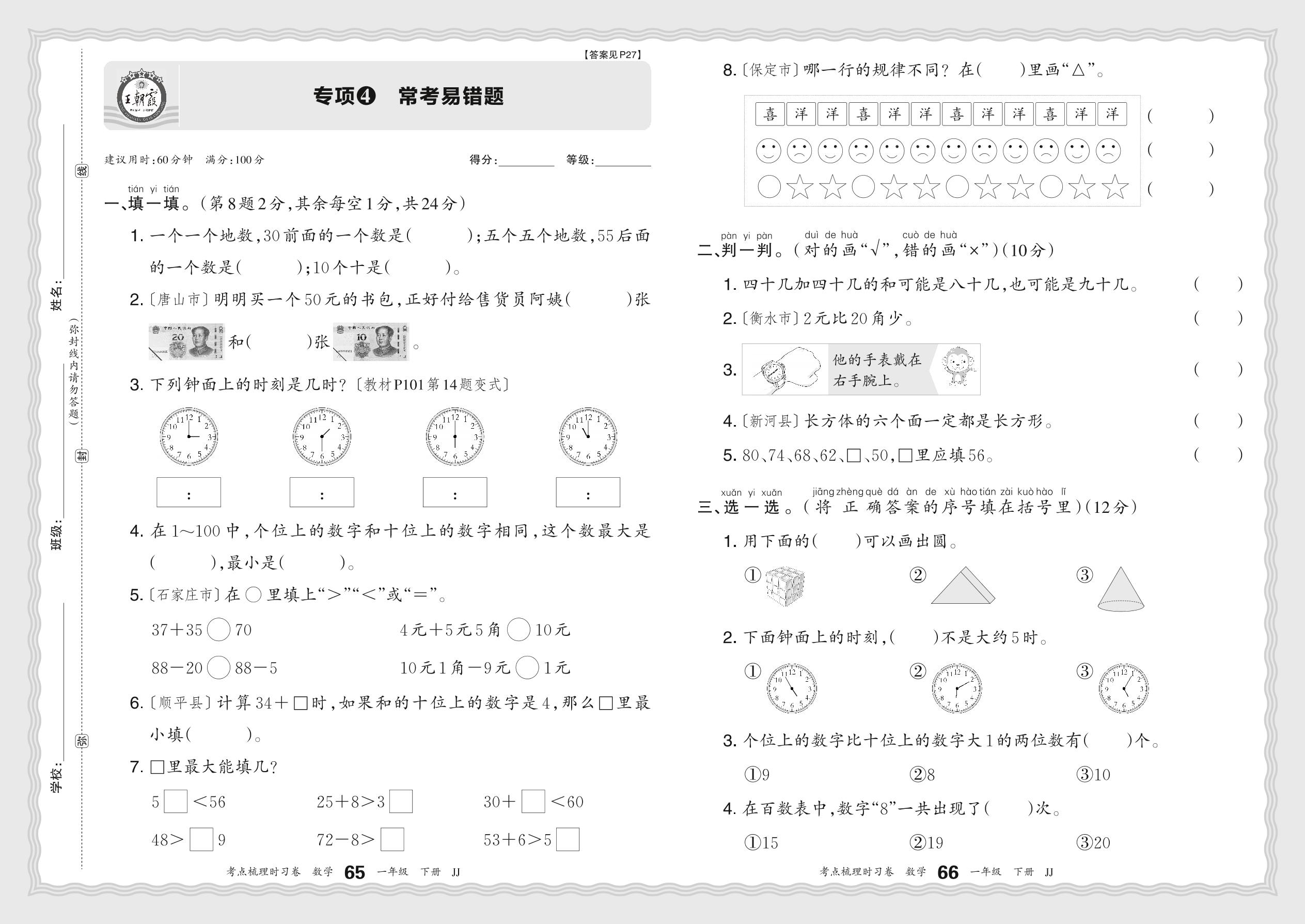 一年级数学冀教版下册专项卷