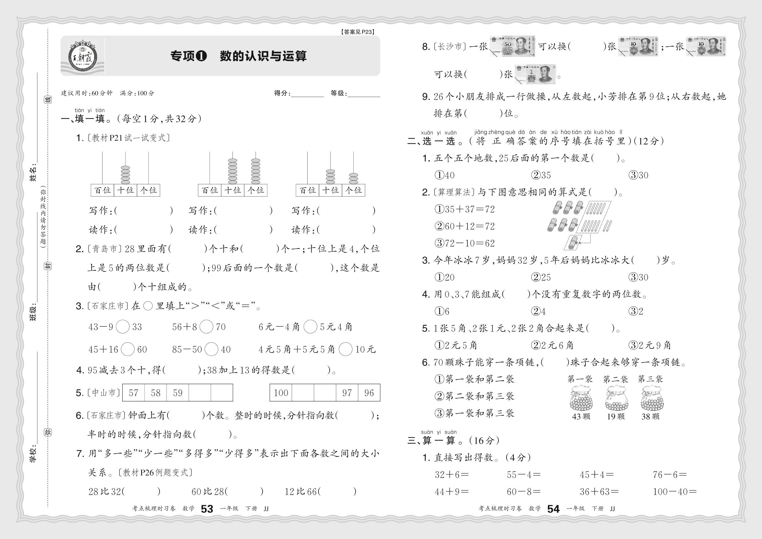 一年级数学冀教版下册专项卷