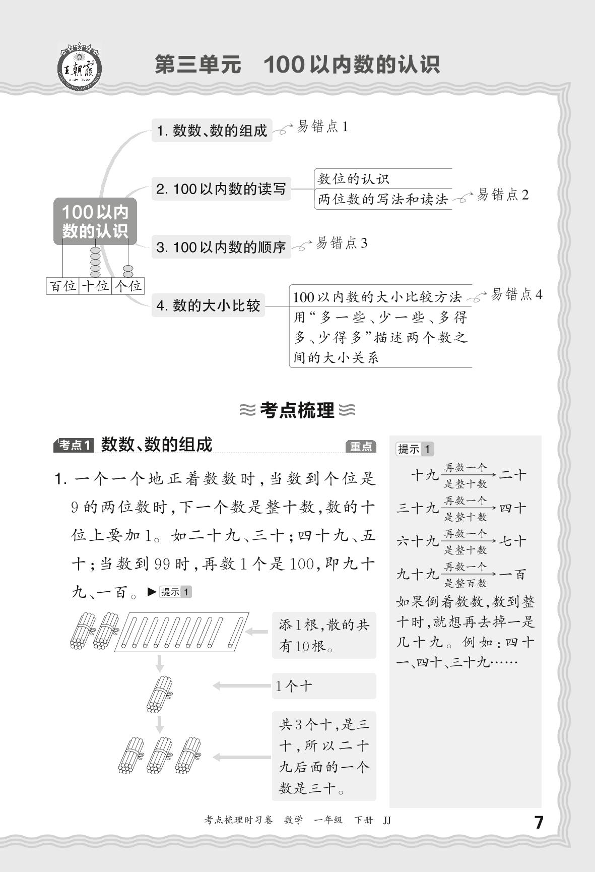 2024春下册一年级数学冀教版 考点梳理手册——第三单元 100以内数的认识