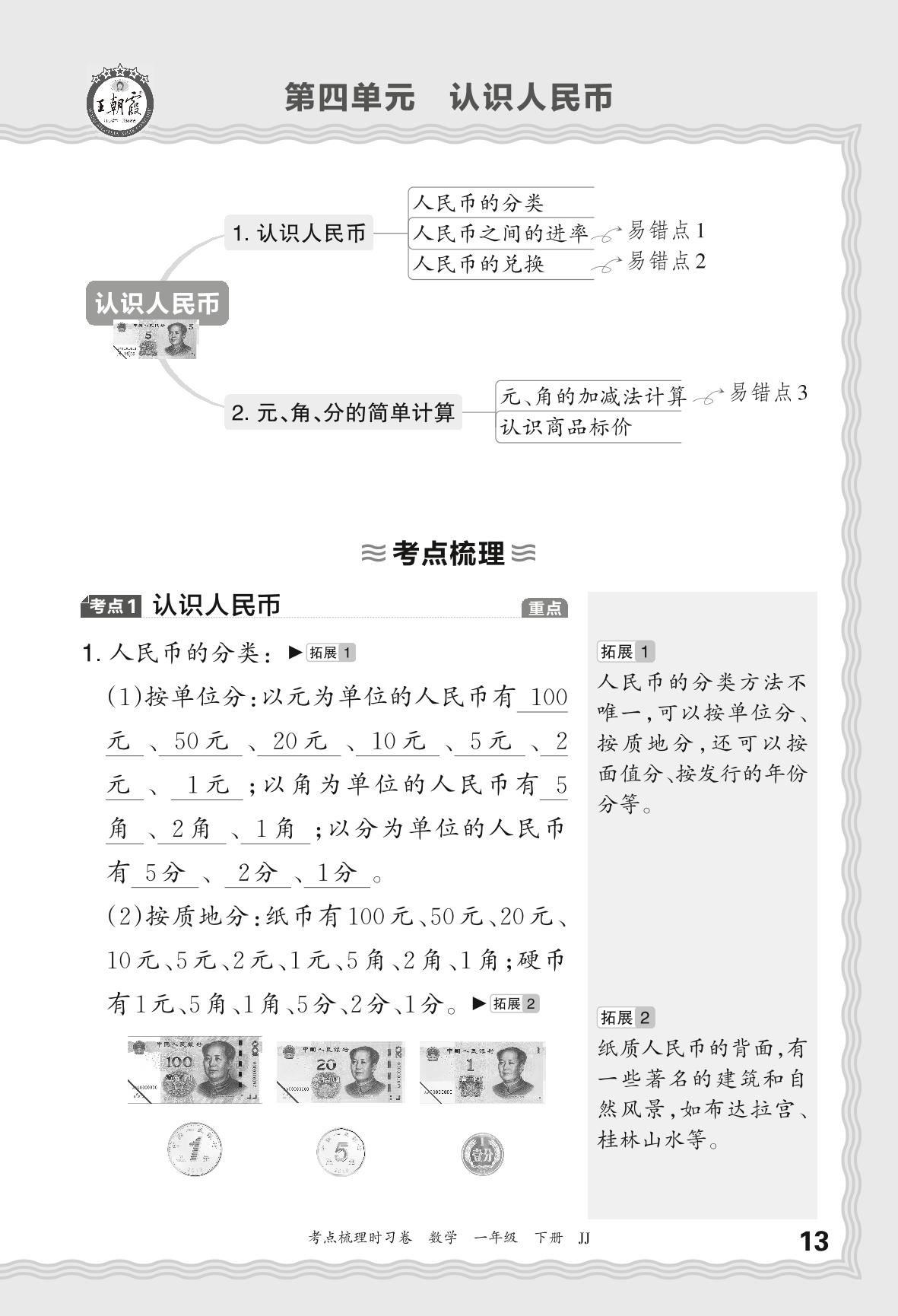 2024春下册一年级数学冀教版 考点梳理手册——第四单元 认识人民币