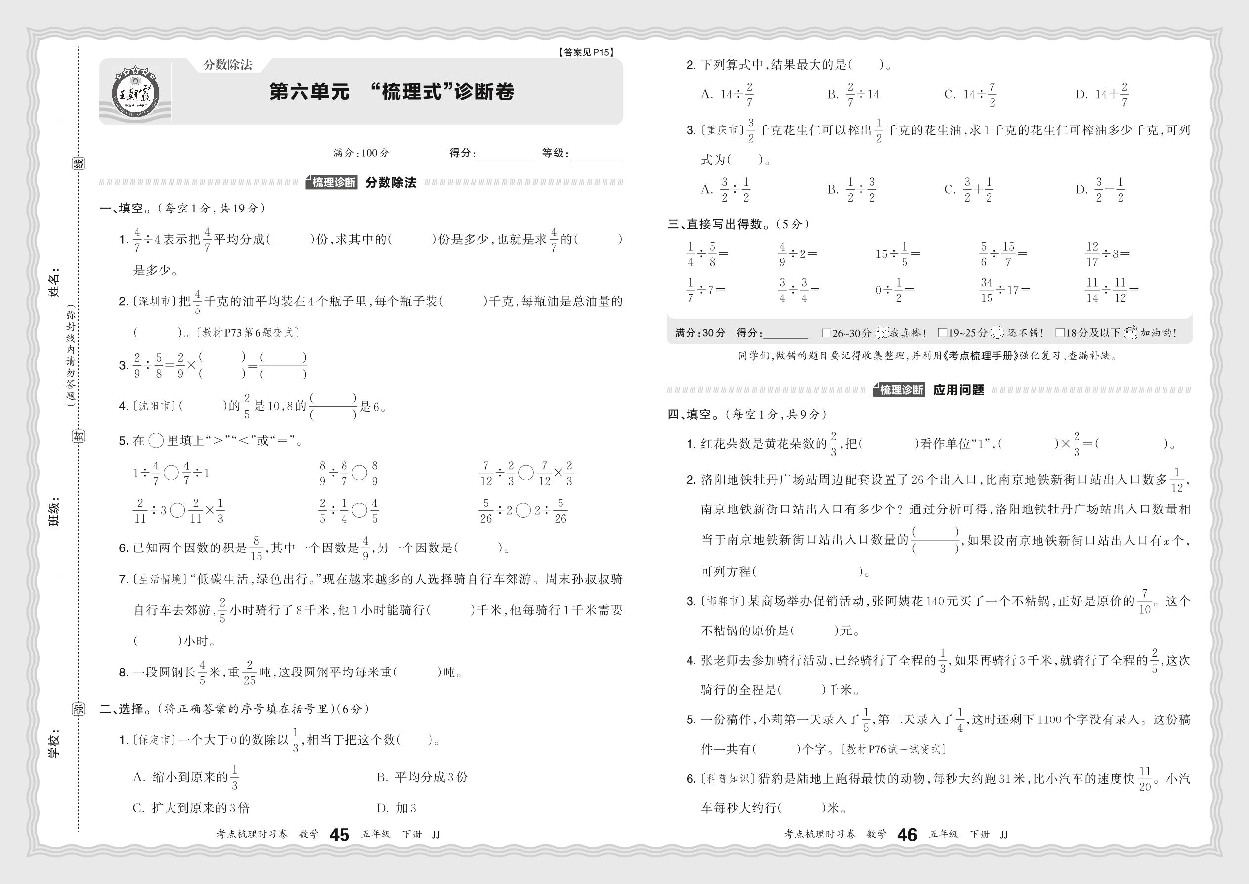 2024春下册五年级数学冀教版 第六单元 “梳理式”诊断卷