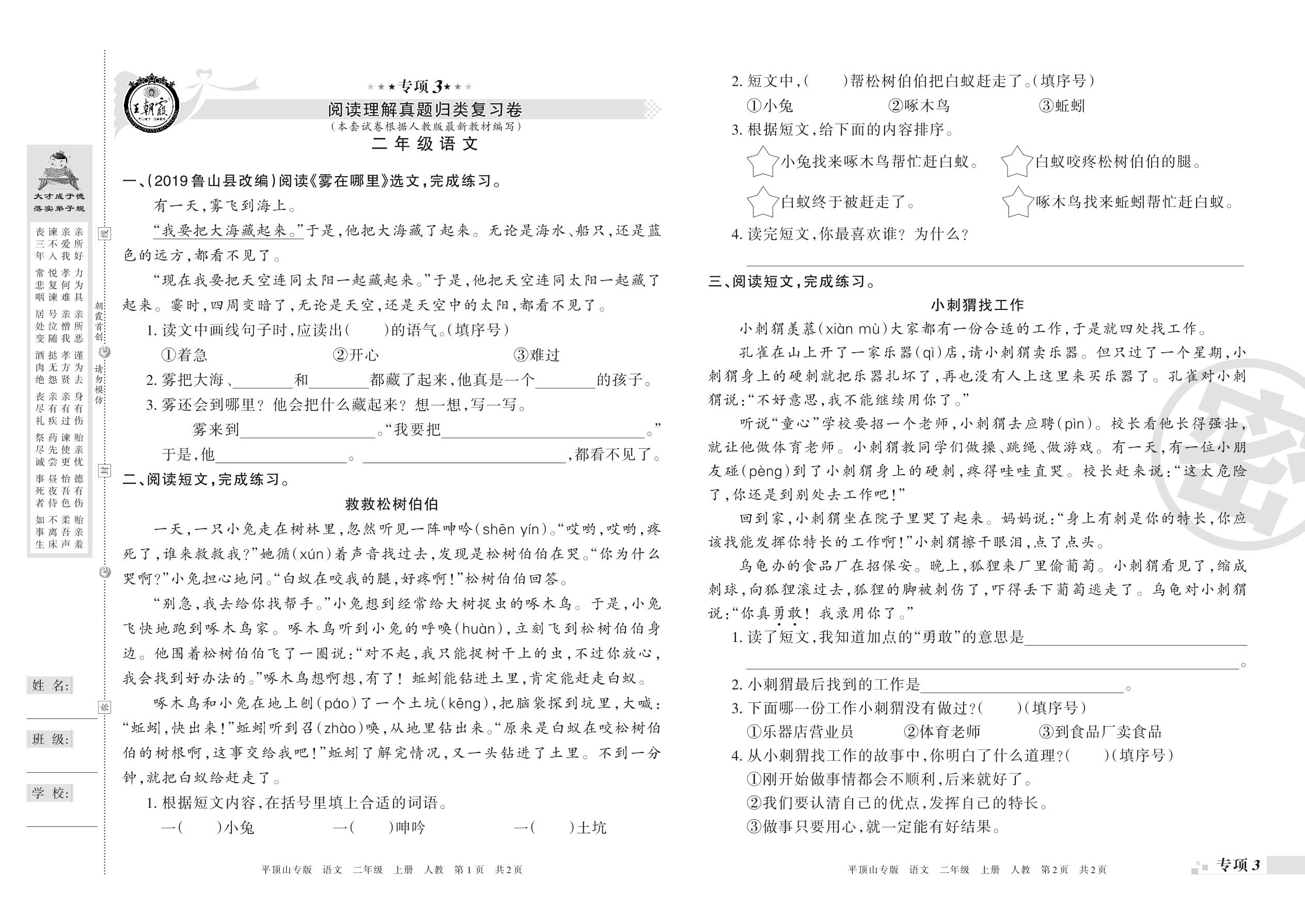 王朝霞期末专项卷——阅读理解、写话真题归类复习二年级上册语文(人教版)_R21080164226【0】