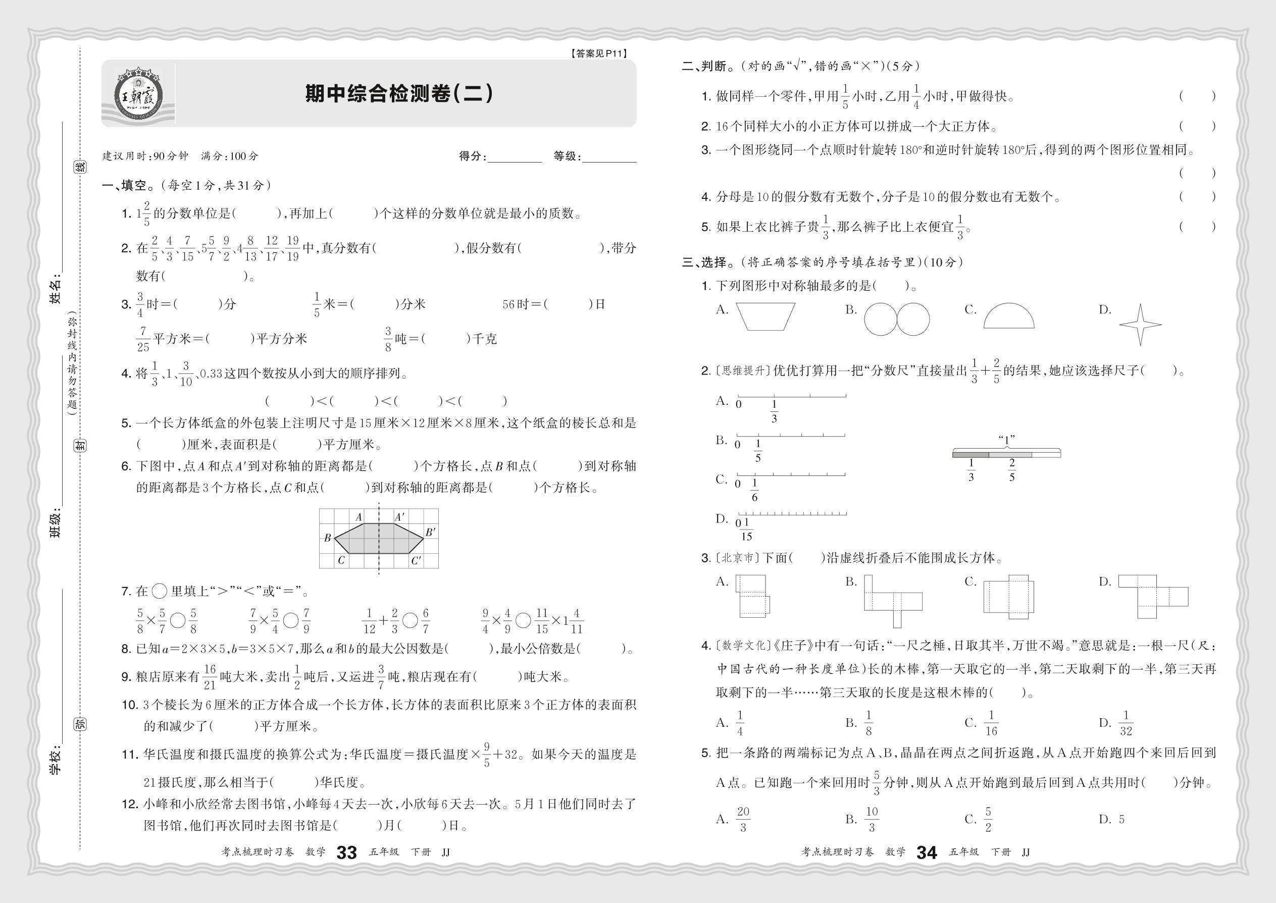 2024春下册五年级数学冀教版 期中综合检测卷(二)