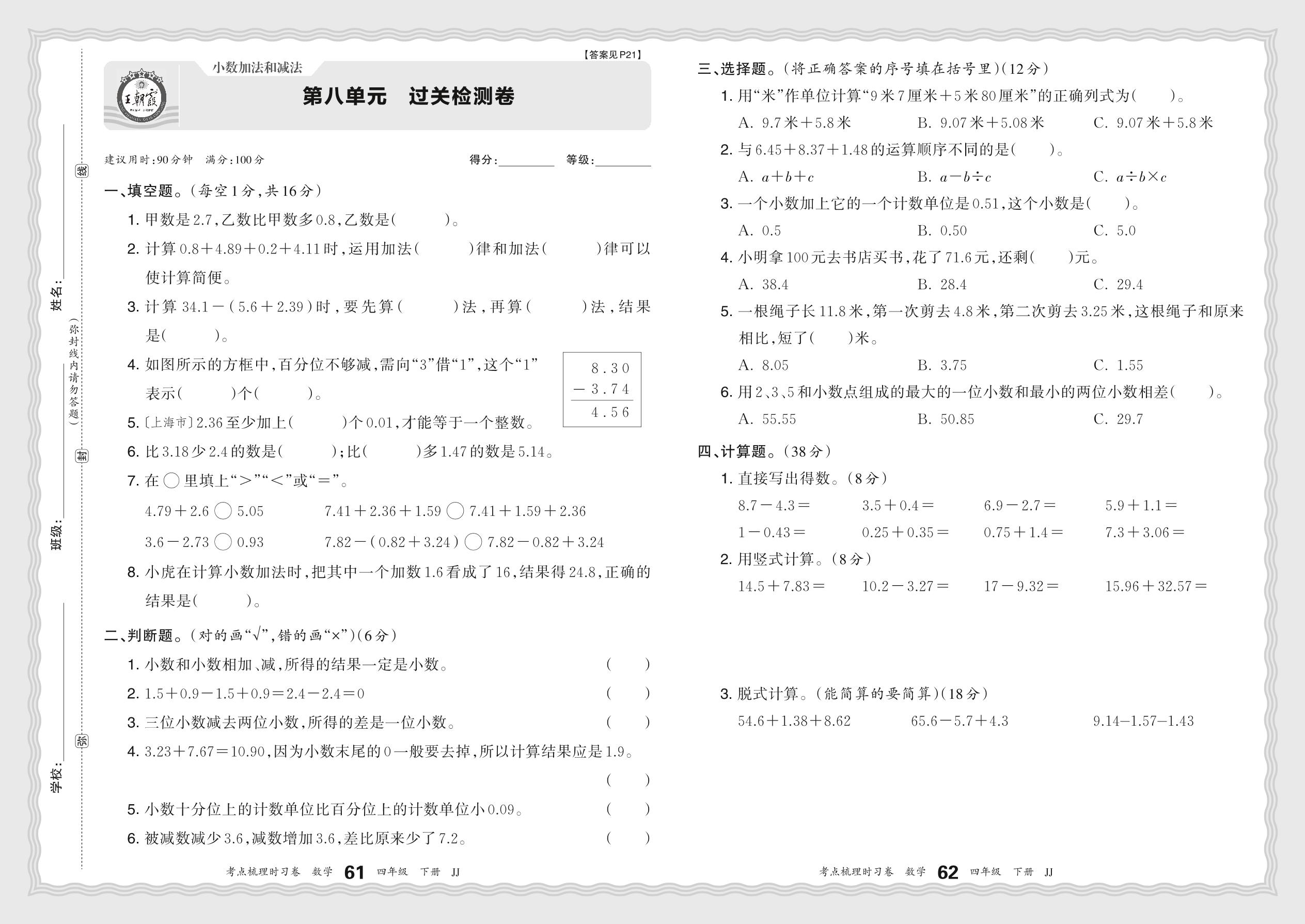 2024春下册四年级数学冀教版 第八单元 过关检测卷