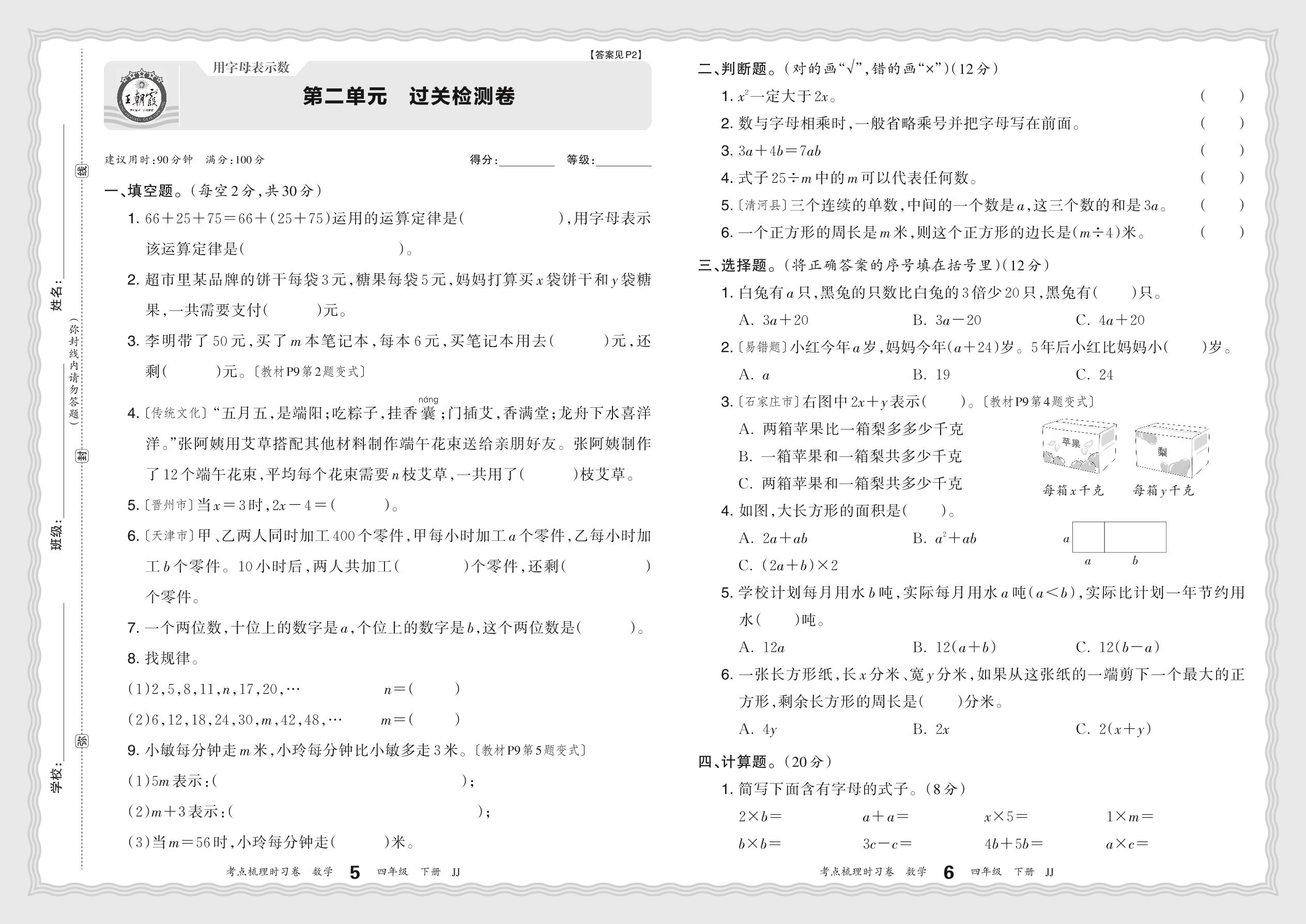 2024春下册四年级数学冀教版 第二单元 过关检测卷