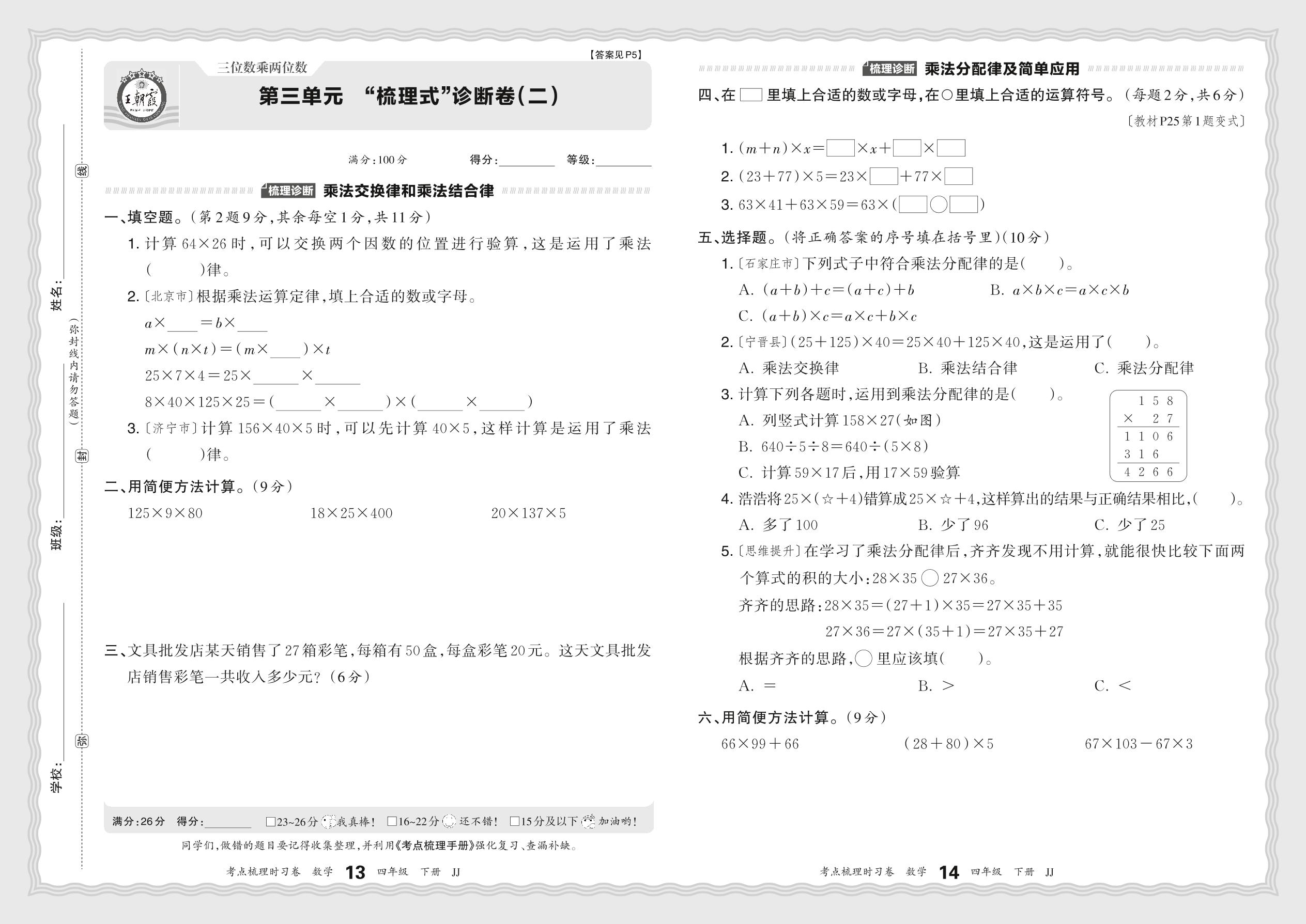 2024春下册四年级数学冀教版 第三单元 “梳理式”诊断卷(二)