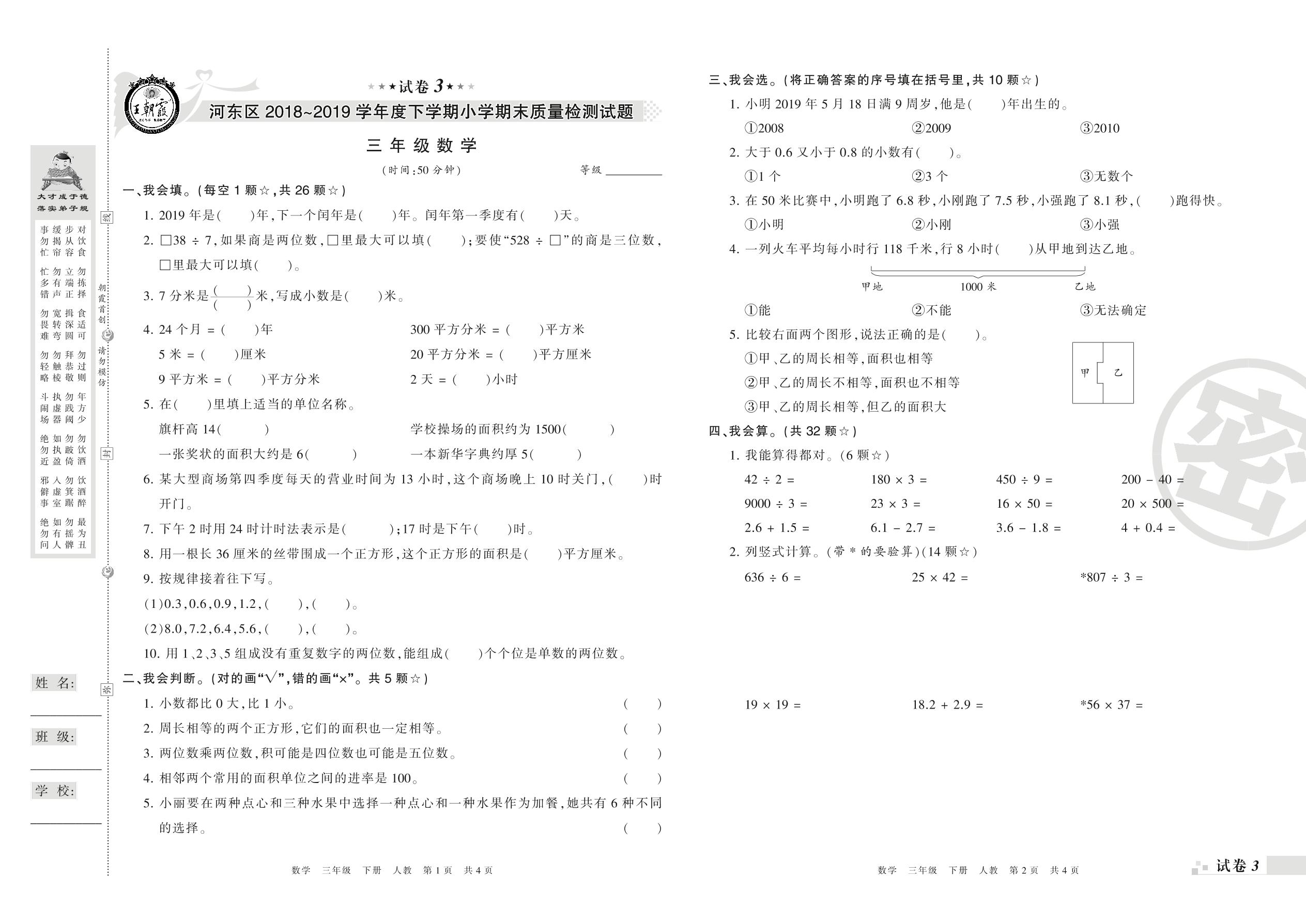 2018-2019学年第二学期临沂市河东区三年级数学试卷(人教版)【3】