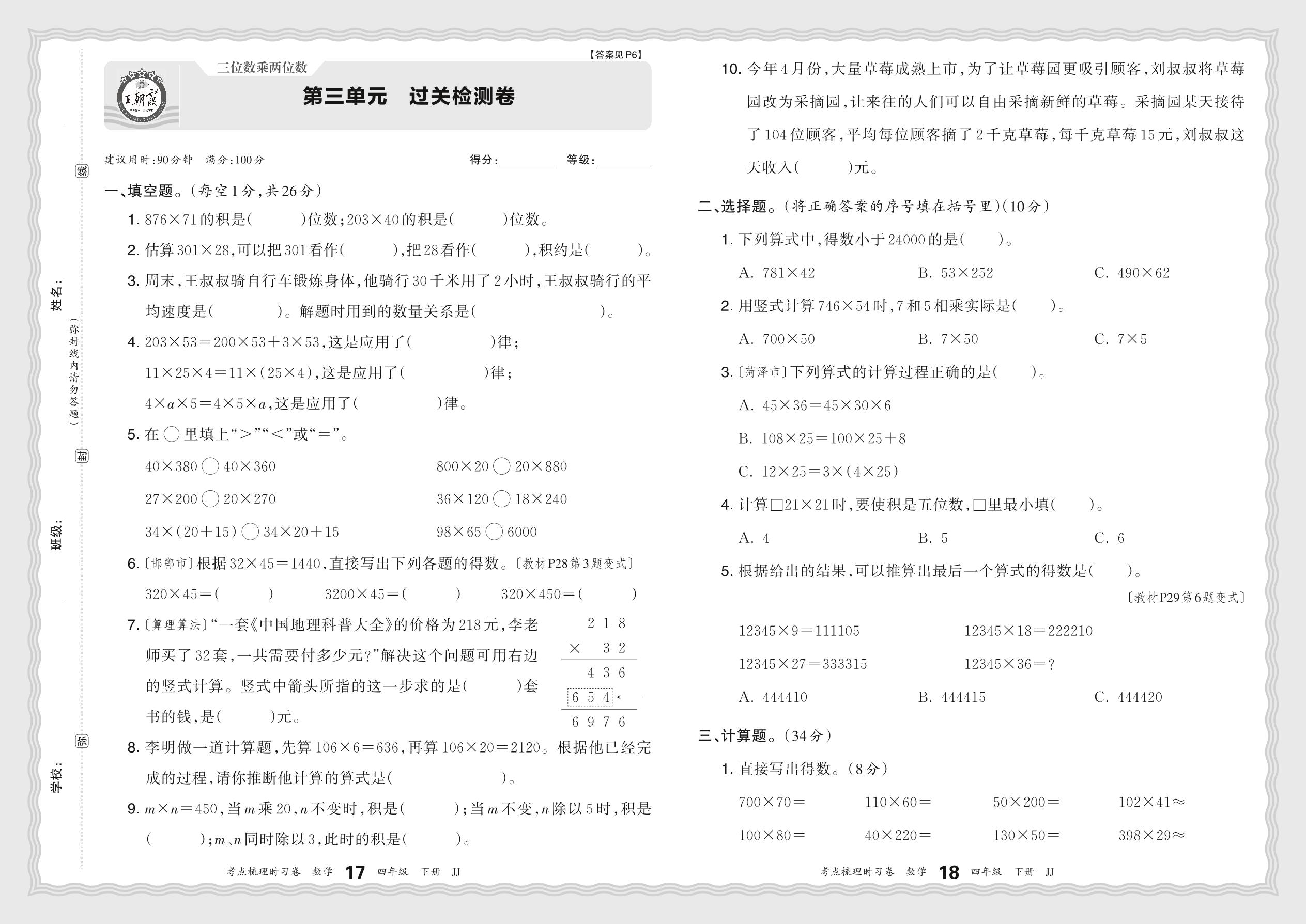 2024春下册四年级数学冀教版 第三单元 过关检测卷