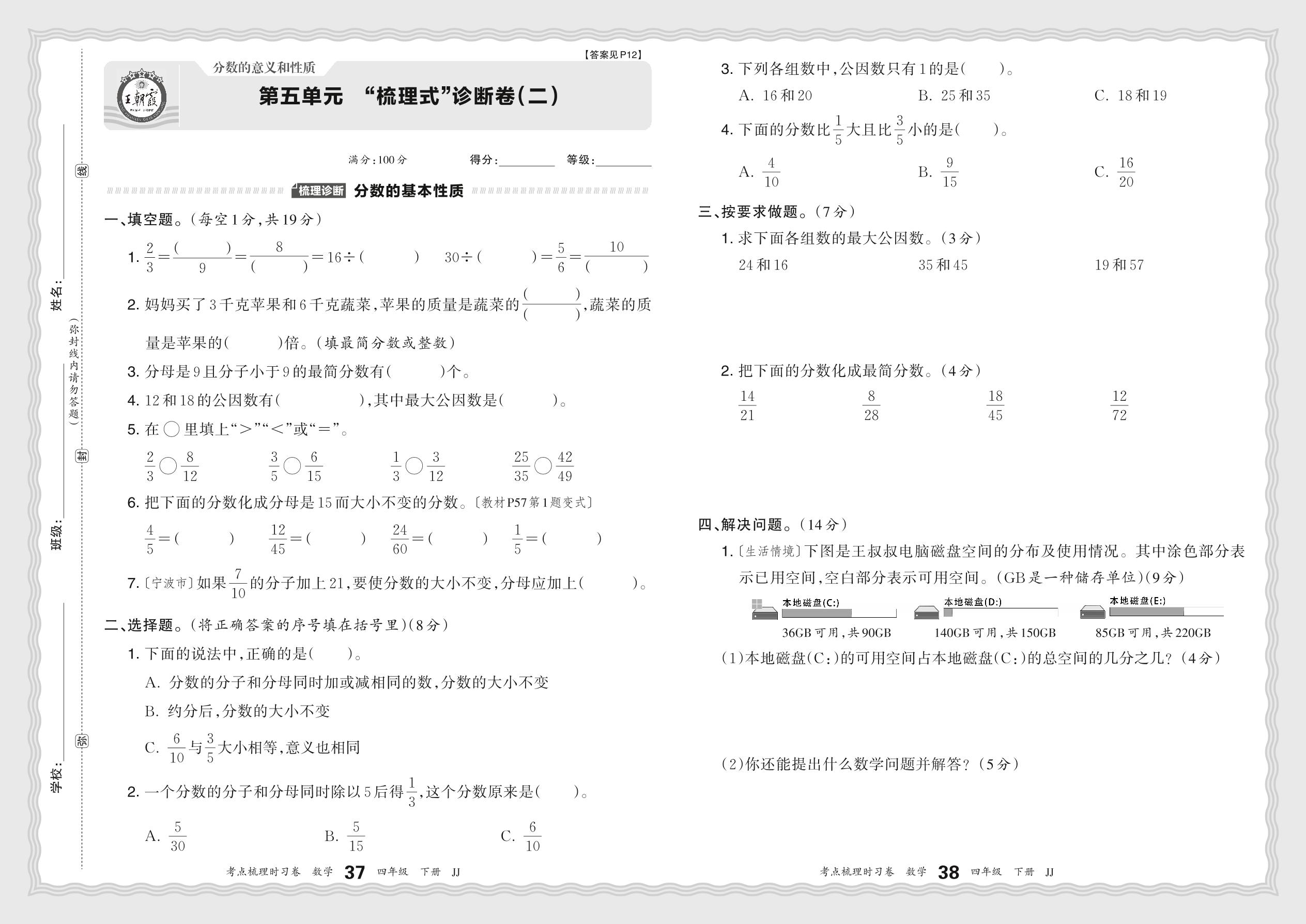 2024春下册四年级数学冀教版 第五单元 “梳理式”诊断卷(二)