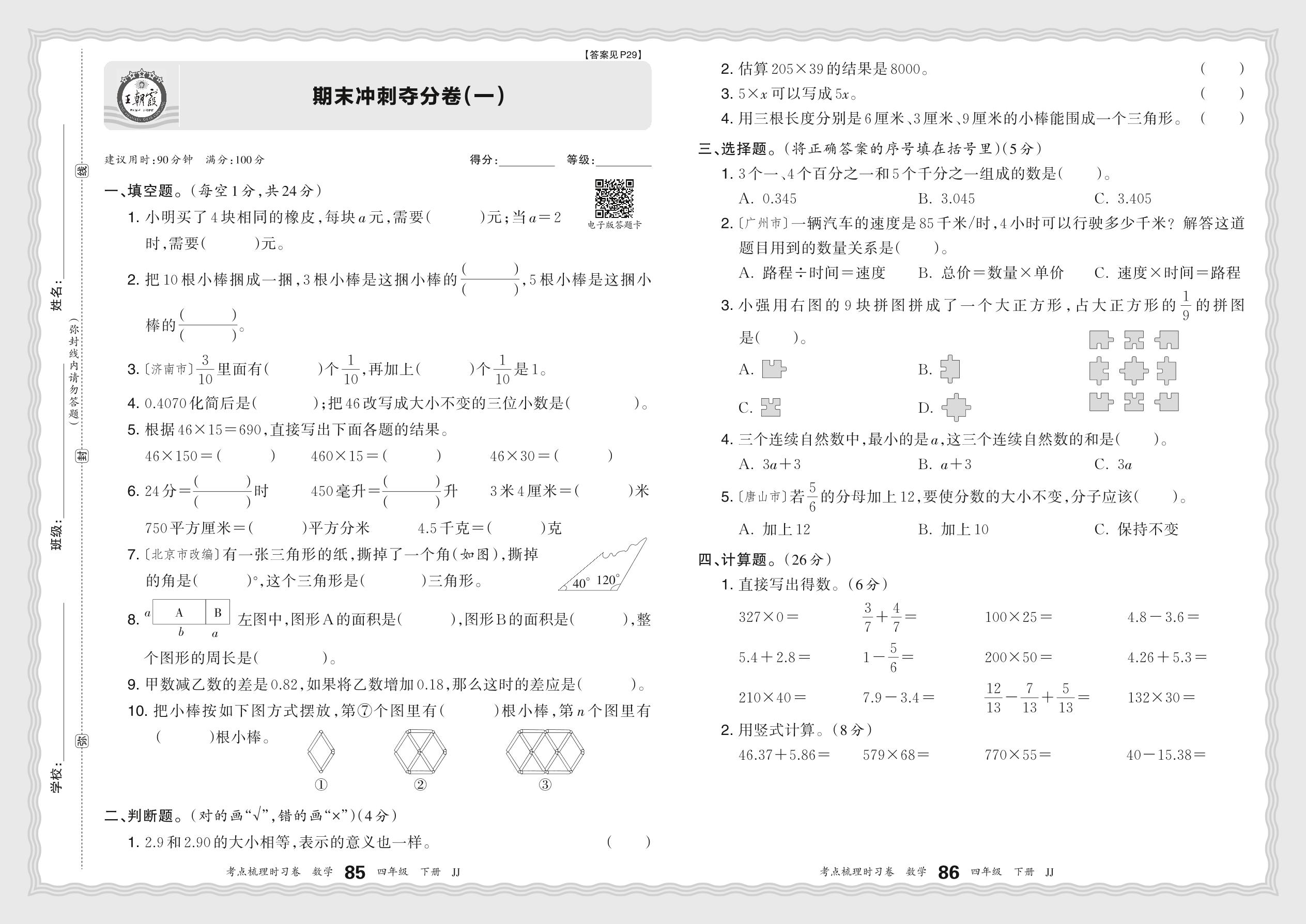 2024春下册四年级数学冀教版 期末冲刺夺分卷(一)