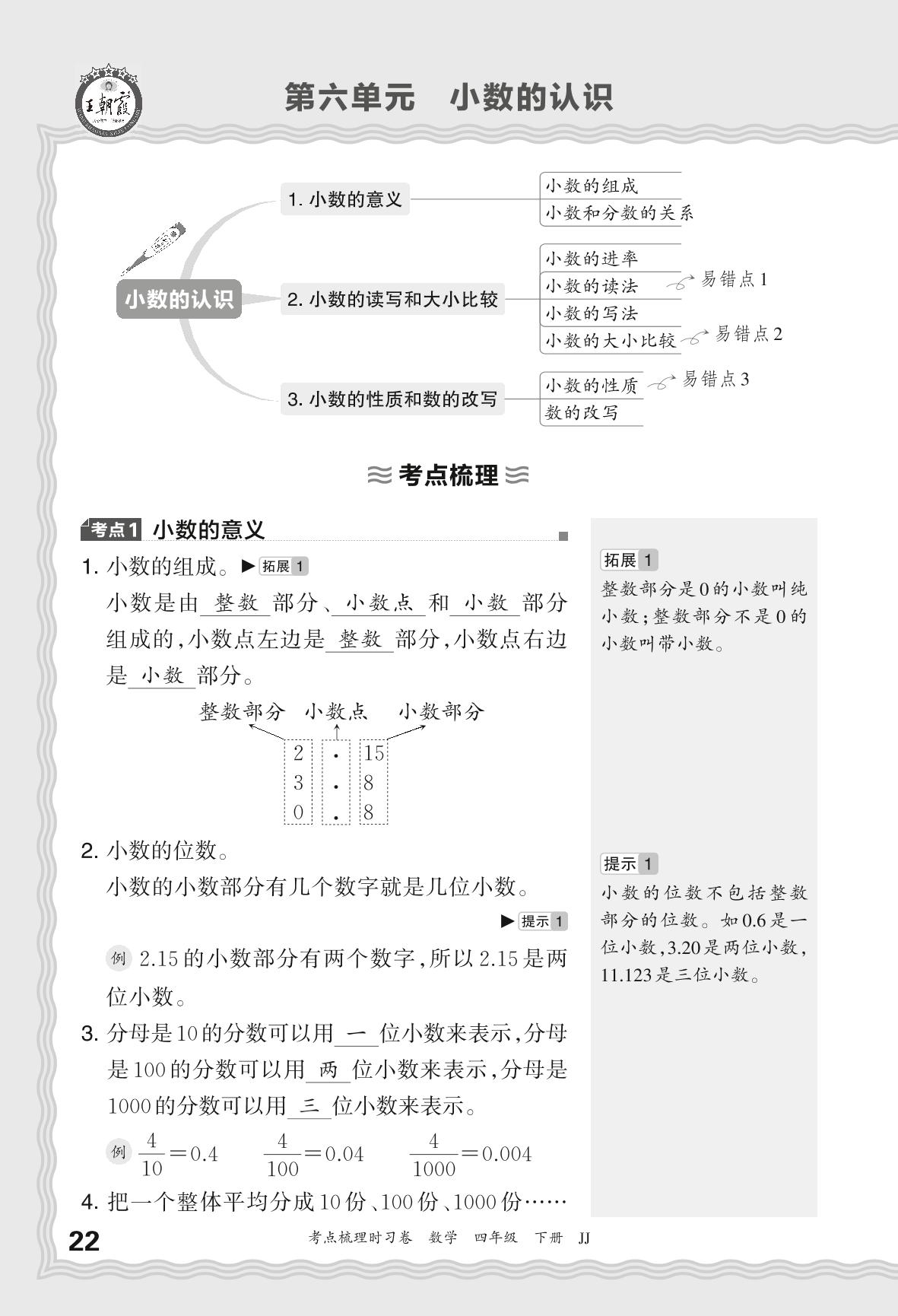2024春下册四年级数学冀教版 考点梳理手册——第六单元 小数的认识