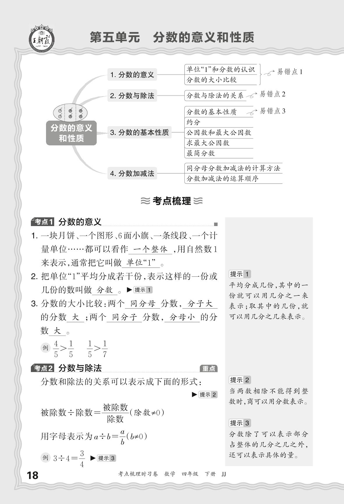 2024春下册四年级数学冀教版 考点梳理手册——第五单元 分数的意义和性质