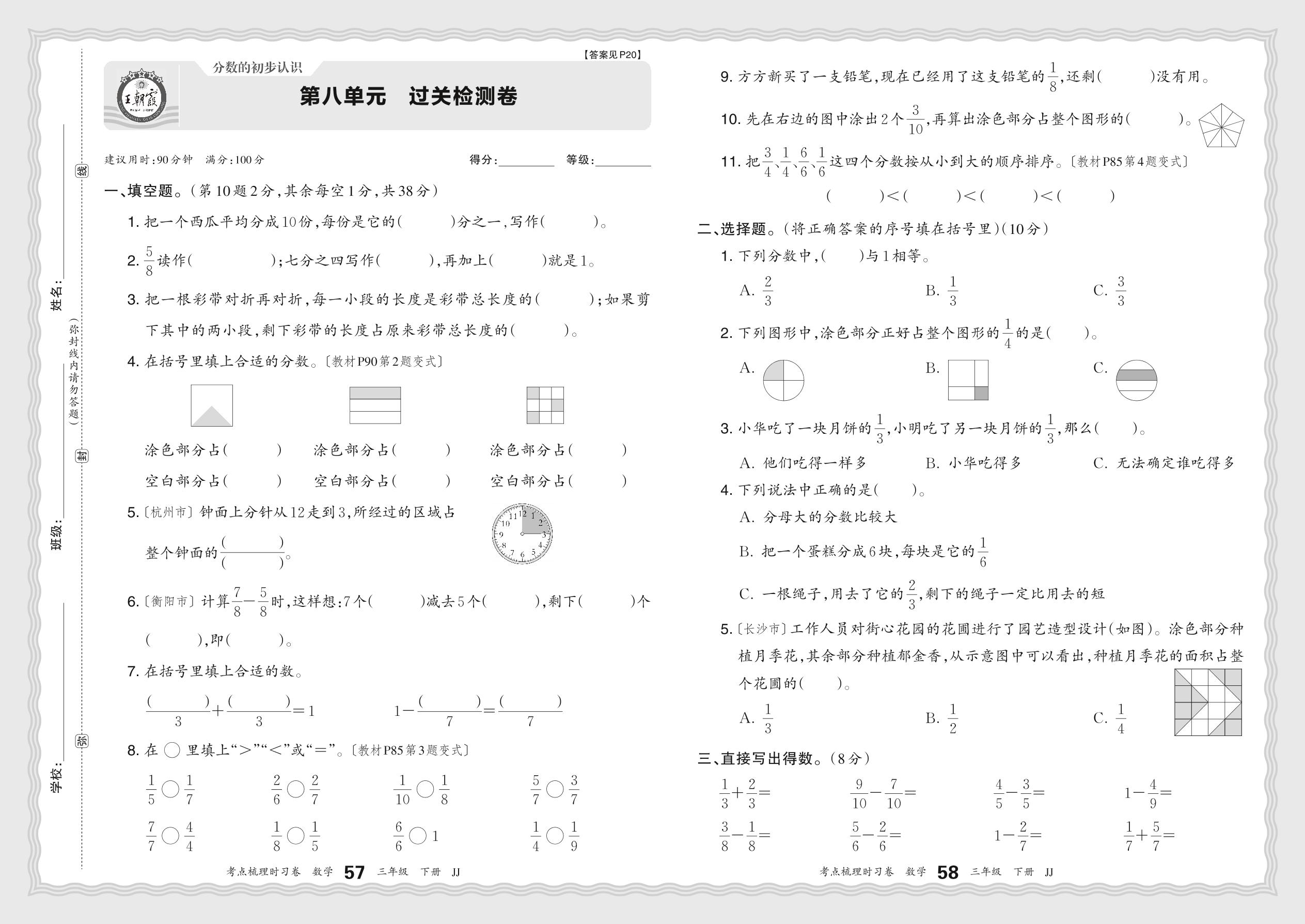 2024春下册三年级数学冀教版 第八单元 过关检测卷