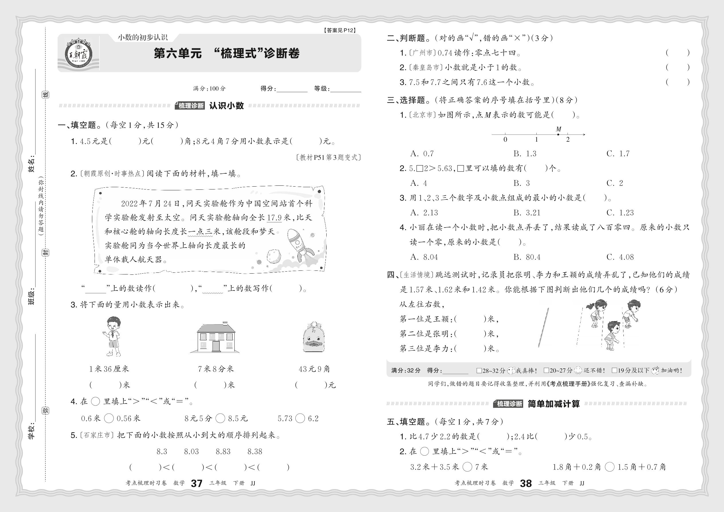 2024春下册三年级数学冀教版 第六单元 “梳理式”诊断卷