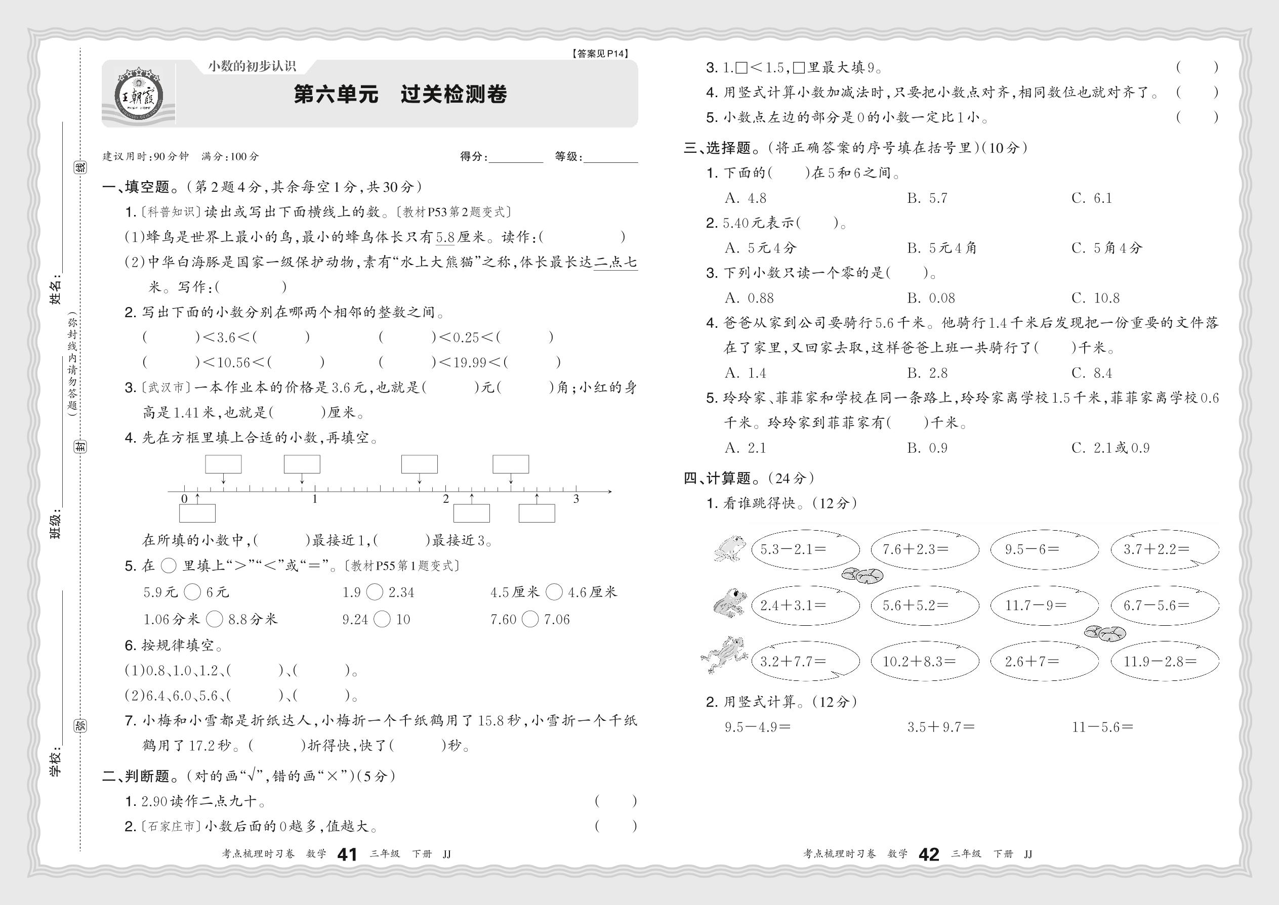 2024春下册三年级数学冀教版 第六单元 过关检测卷