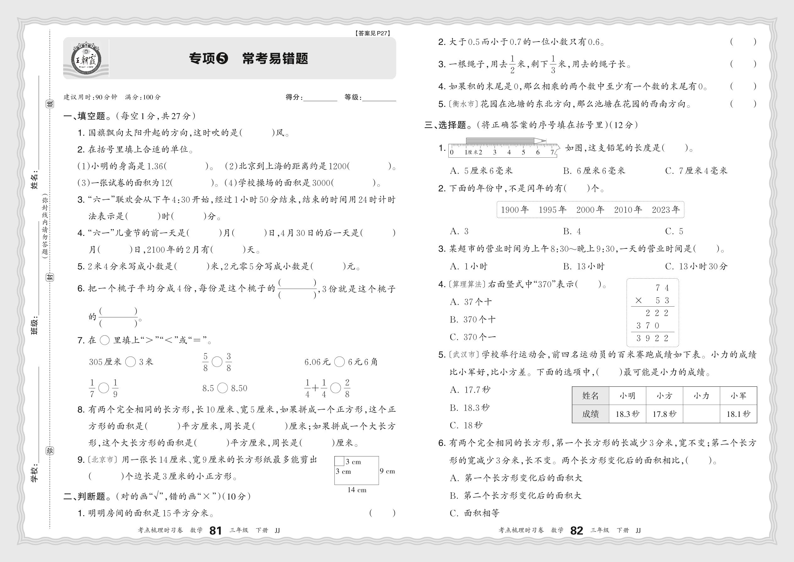 2024春下册三年级数学冀教版 期末专项卷KD版·常考易错题【5】
