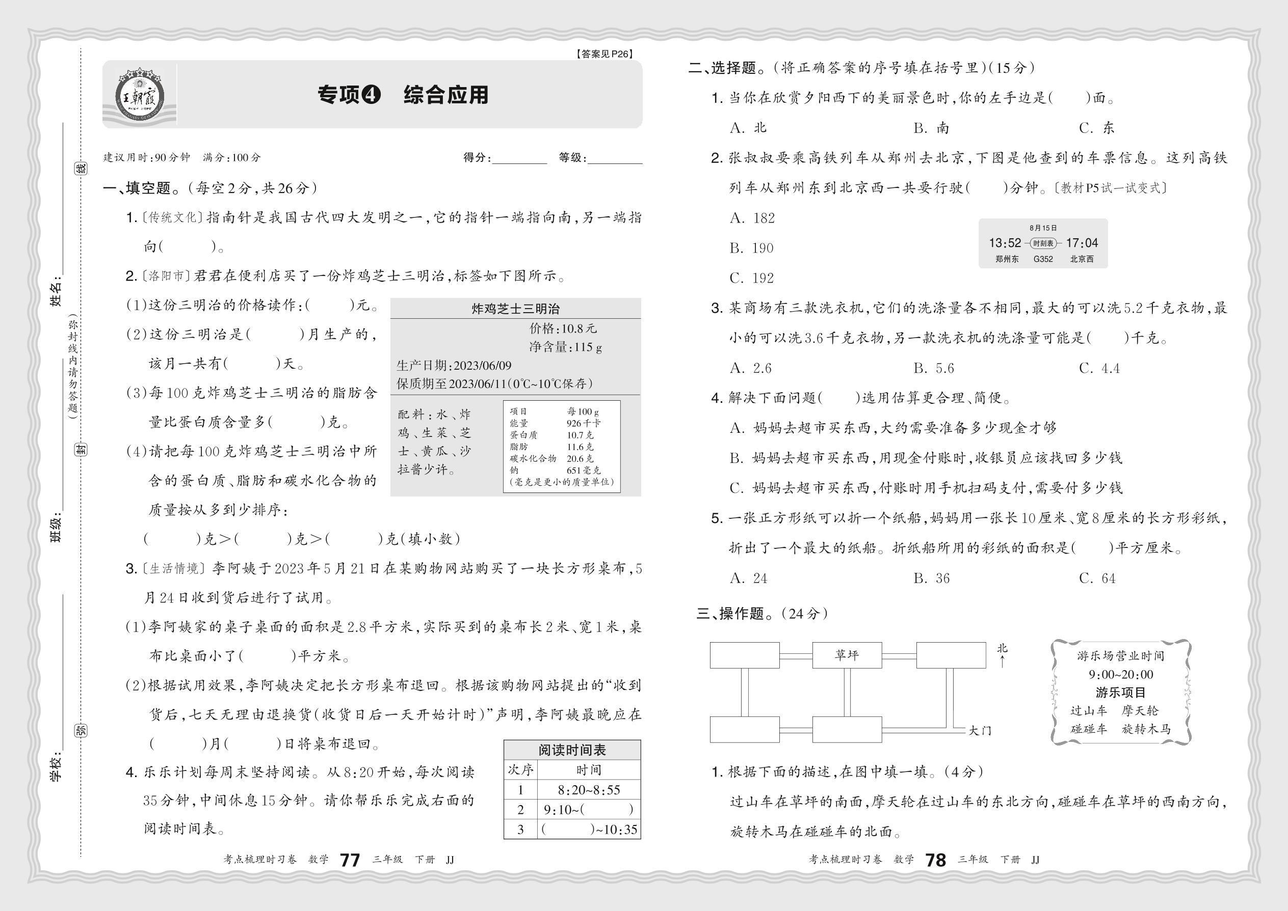 2024春下册三年级数学冀教版 期末专项卷KD版·综合应用【4】