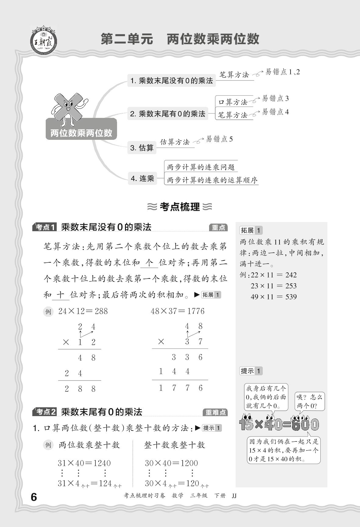 2024春下册三年级数学冀教版 考点梳理手册——第二单元 两位数乘两位数
