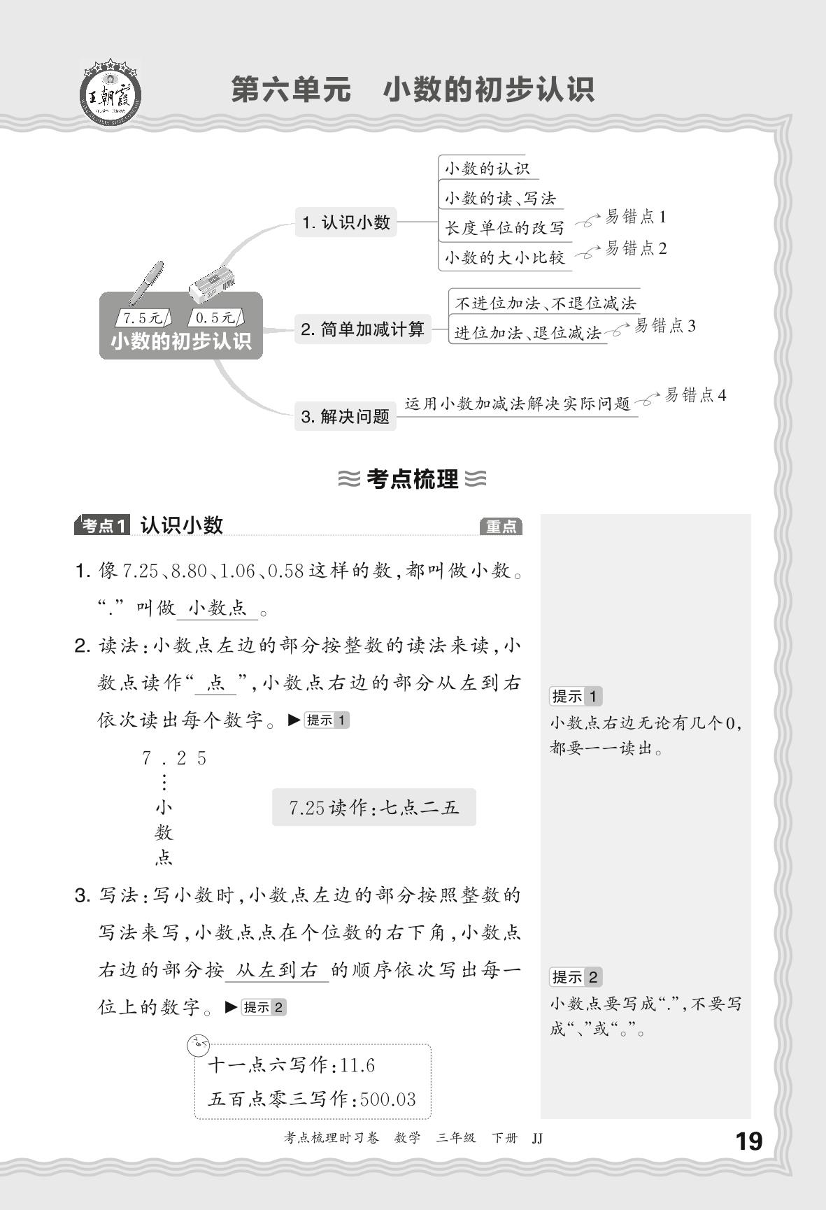 2024春下册三年级数学冀教版 考点梳理手册——第六单元 小数的初步认识