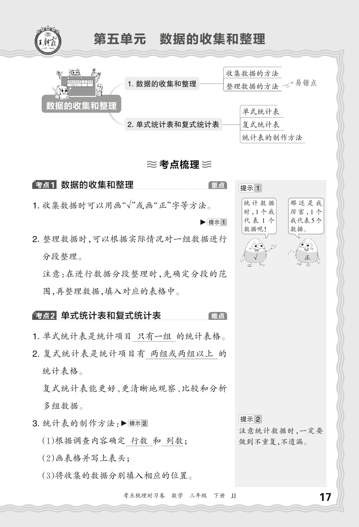 2024春下册三年级数学冀教版 考点梳理手册——第五单元 数据的收集和整理