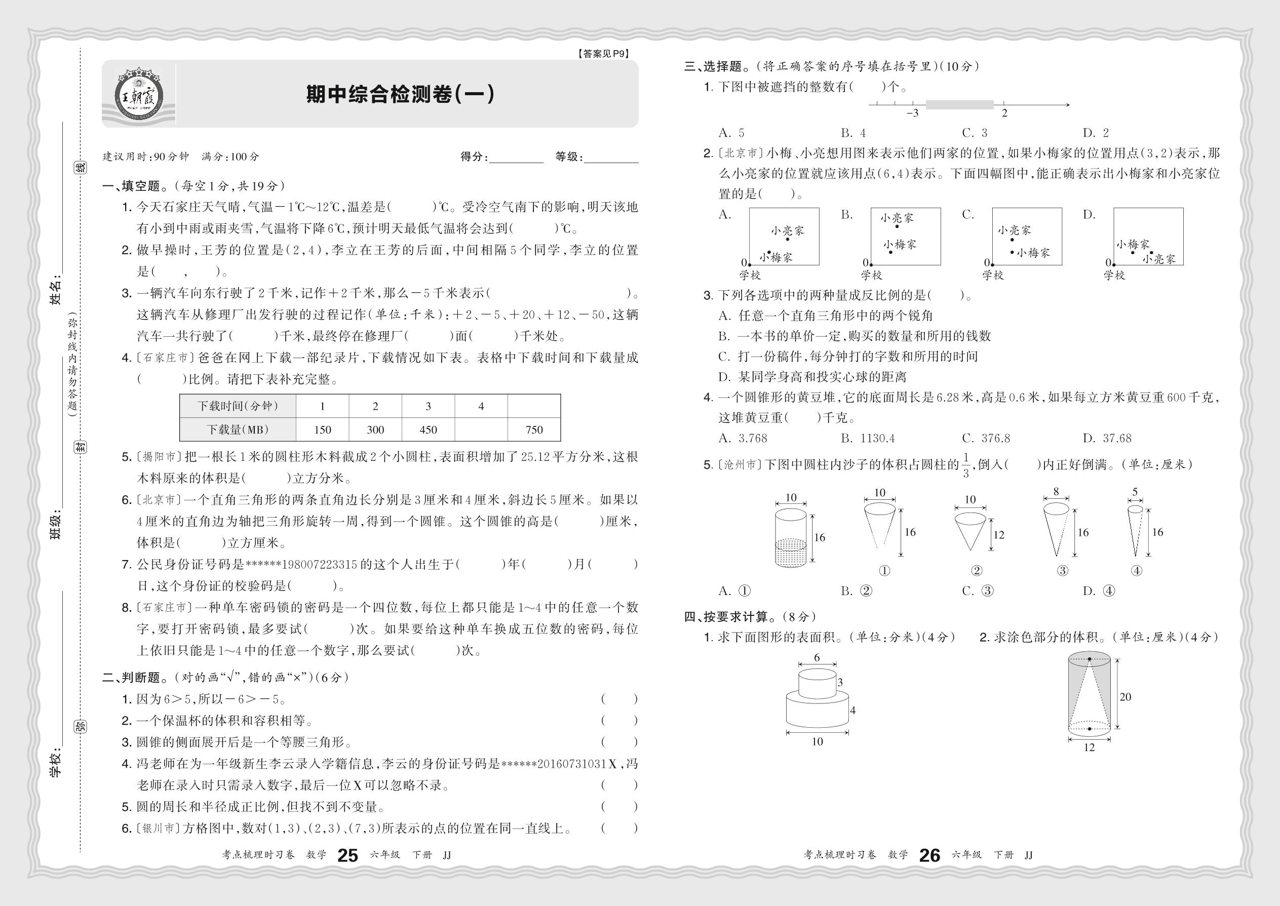 2024春下册六年级数学冀教版 期中综合检测卷(一)