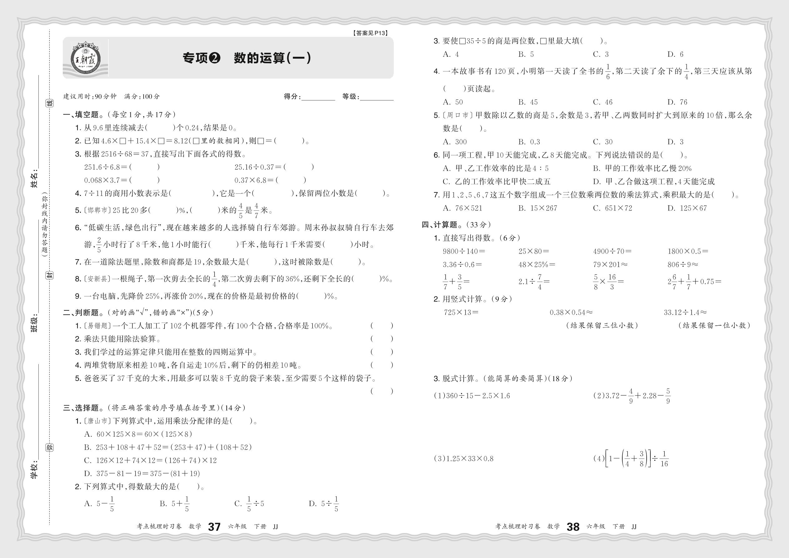 2024春下册六年级数学冀教版 期末专项卷KD版·数的运算(一)【2】