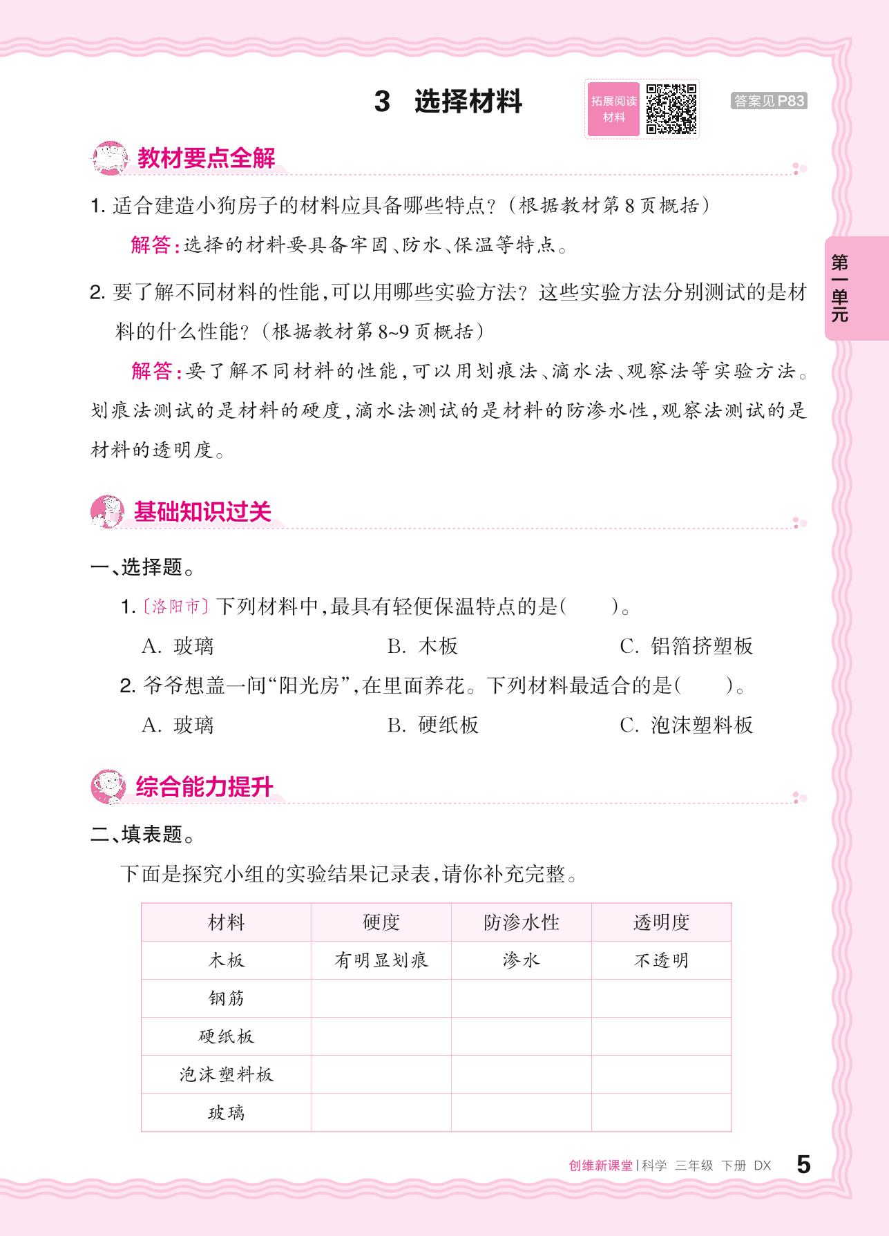 2024春下册三年级科学大象版 第一单元 小小建筑师——3. 选择材料