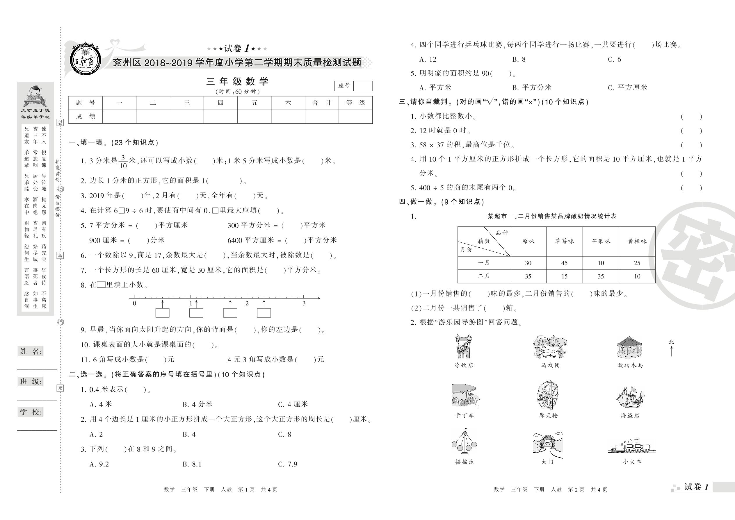 2018-2019学年第二学期济宁市兖州区三年级数学试卷(人教版)【1】