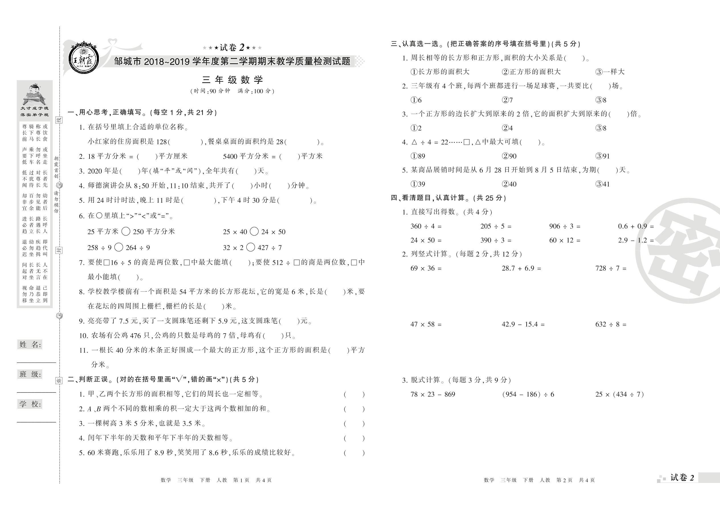 2018-2019学年第二学期邹城市三年级数学试卷(人教版)【2】
