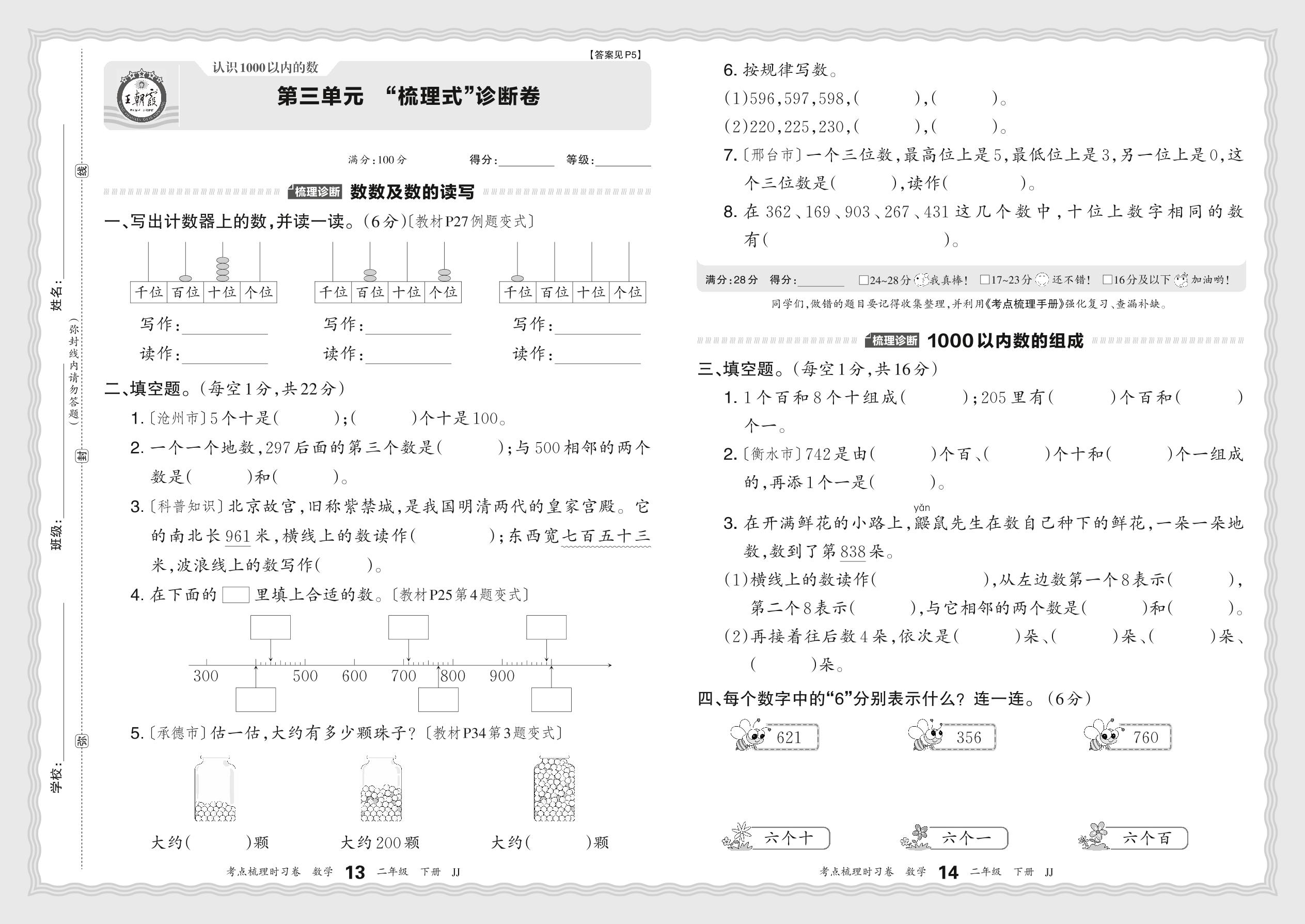 2024春下册二年级数学冀教版 第三单元 “梳理式”诊断卷
