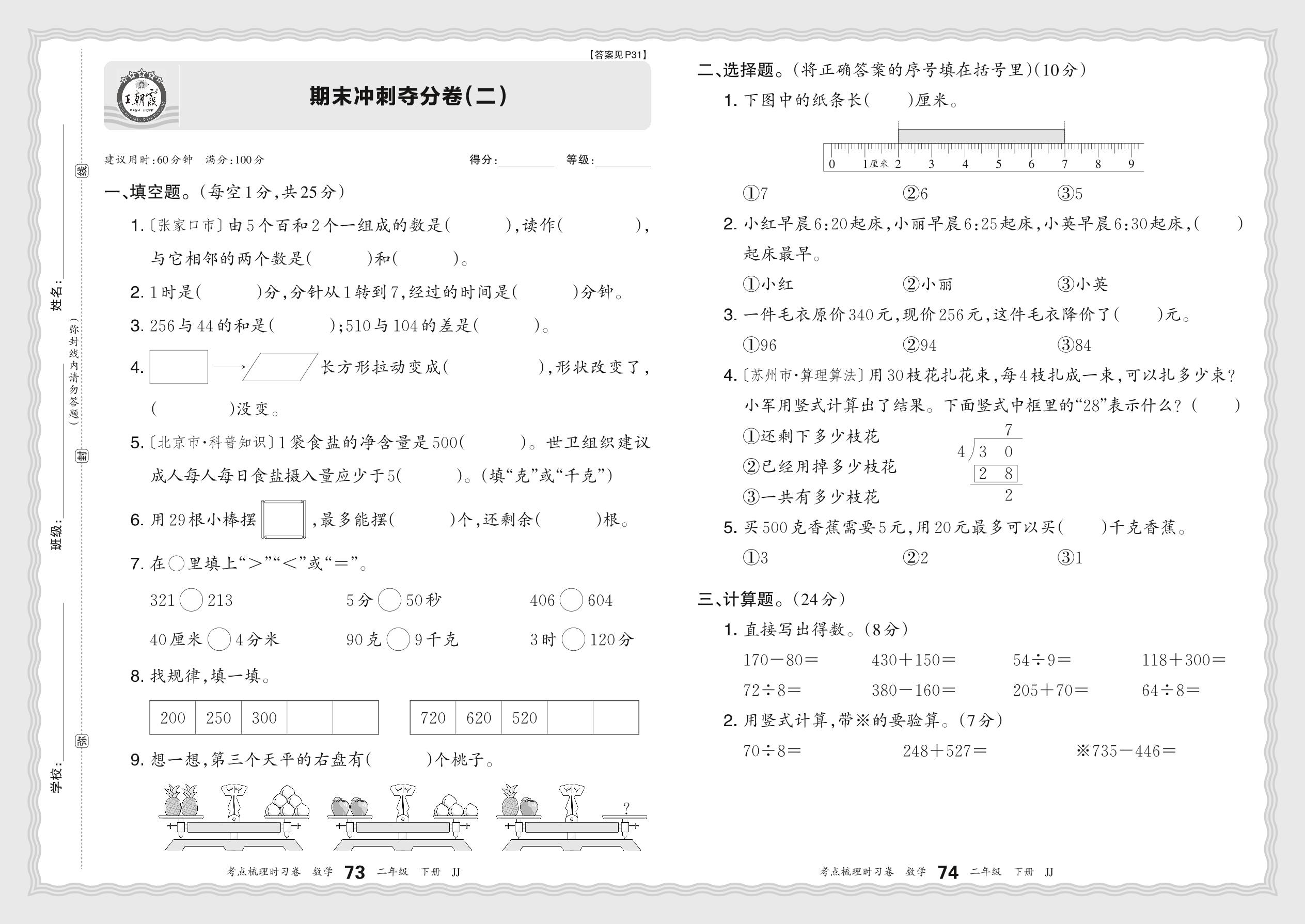 2024春下册二年级数学冀教版 期末冲刺夺分卷(二)