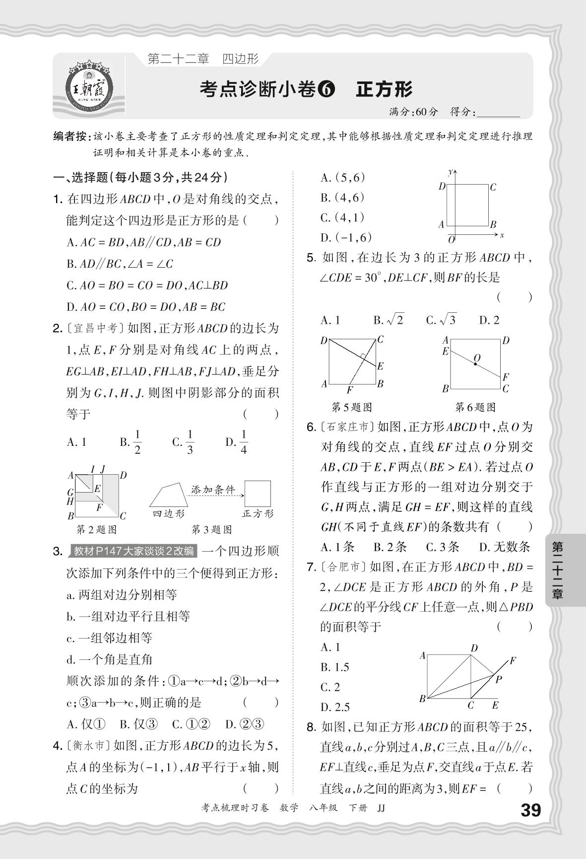 2024春下册八年级数学冀教版 第二十二章 考点诊断小卷 正方形【6】