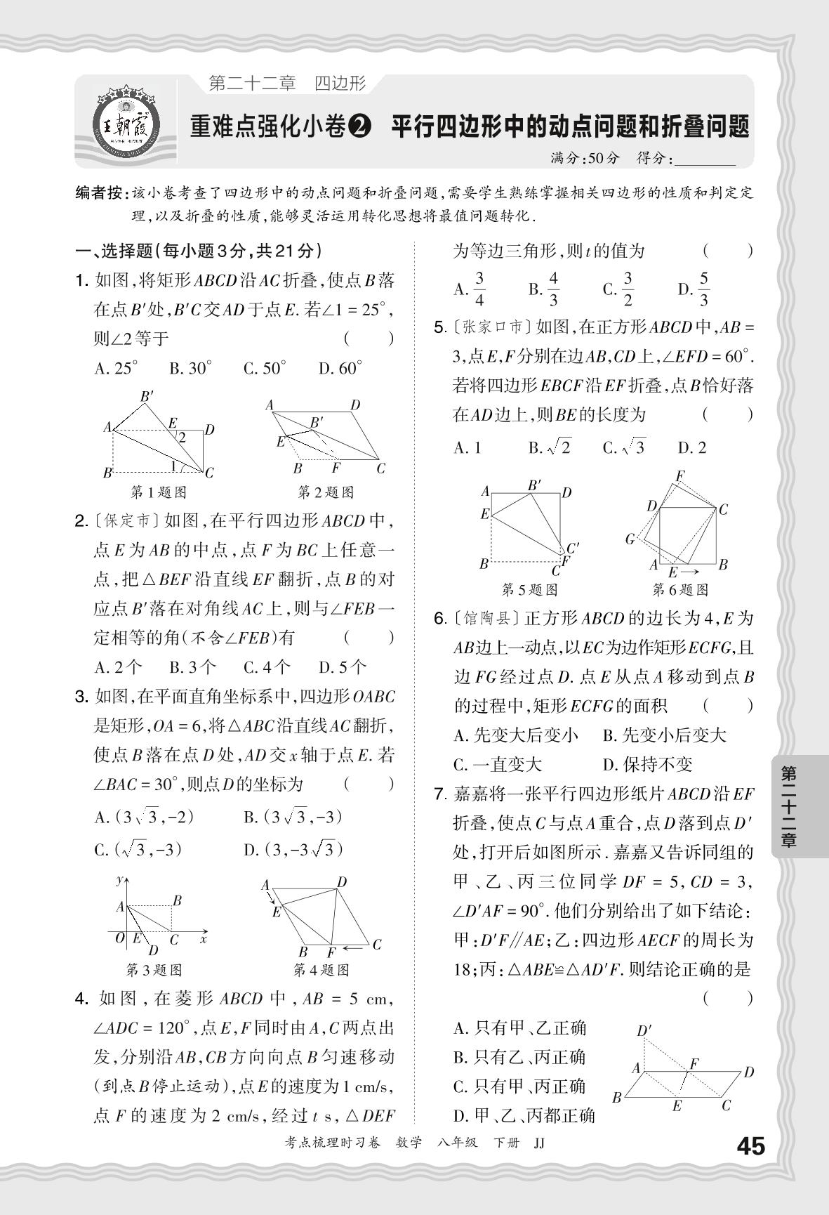 2024春下册八年级数学冀教版 第二十二章 重难点强化小卷 平行四边形中的动点问题和折叠问题