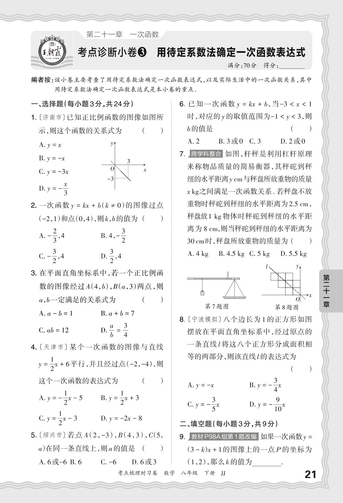 2024春下册八年级数学冀教版 第二十一章 考点诊断小卷 用待定系数法确定一次函数表达式【3】